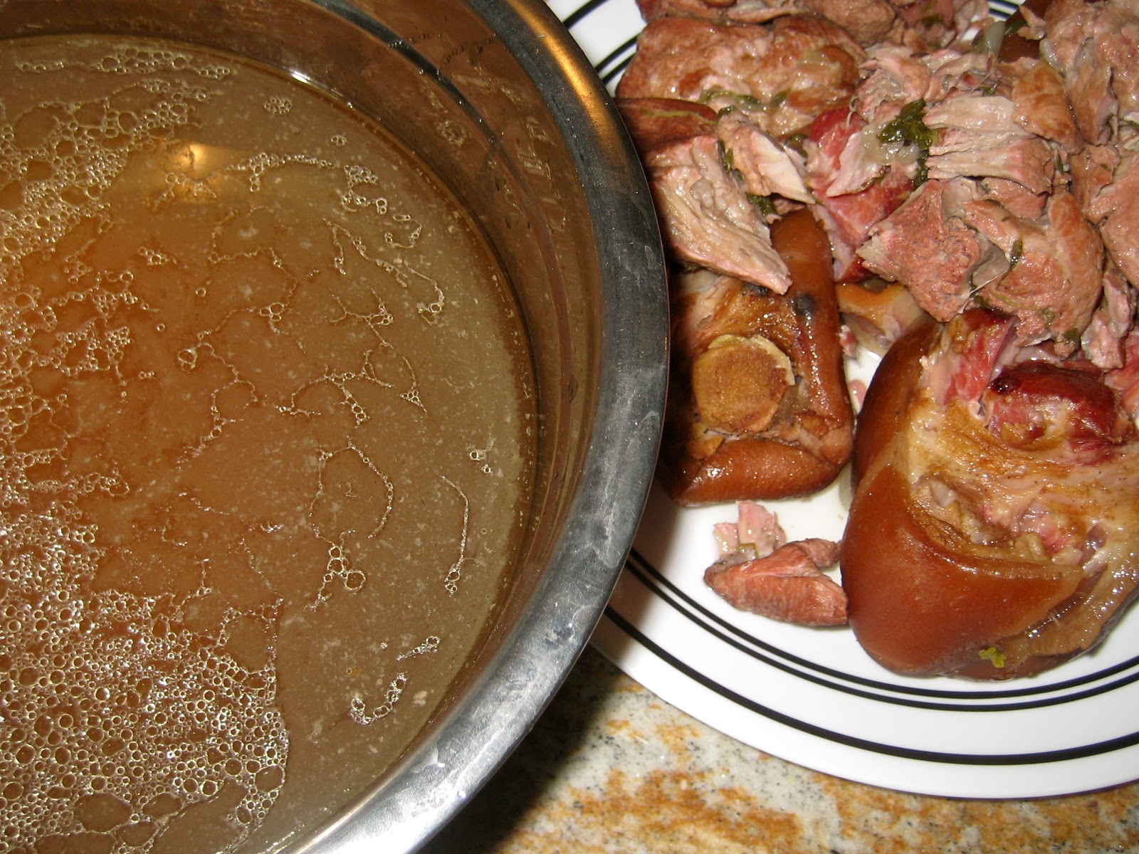 Yesterday we attempted to go grocery shopping for a few last minute items in Kerrville, our county seat. I specifically wanted to buy celery root for the stock, but it wasn’t meant to be. The parking lot of my favorite produce place was overflowing – parking within a reasonable period of time was out of the question. Not worth the hassle for a gnarly root. So our stock today is limited to fennel, celery stalks, white onion, parsley, and carrots. Add to this coriander seeds, black peppercorns, cloves and a few juniper berries, as well as several laurel leaves and sprigs and sprigs of fresh and fragrant thyme. I always go a little overboard with thyme (and rosemary), but it smells so good! To cover all the greasy bases, a few chunks of pork shoulder and a couple of smoked ham hocks go into the pot as well. A grind of this, a pinch of that, plus fourteen cups of water and we’re on our way. And while the stock gently simmers, there is time to visit a neighbor (a round trip of a mere 32 miles. Yes, central Texas is quite spacious) to pick up Barry’s Christmas present. I better not say what it is, in case he reads this.Meanwhile, the stock is ready to be strained, mushy veggies to be discarded. But the meats we want to preserve, to combine with the beans later. This is a murky kind of a stock, containing many flavor particles, which I didn’t bother to clarify. I’m not aiming for a pretty, translucent aspic, just stock for my beans. Simplicity trumps!
