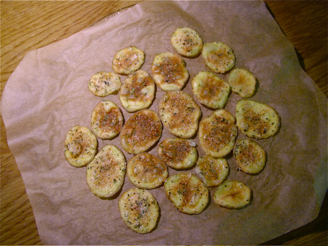 Should you be too lazy or clumsy to skewer the potato slices, there’s another way to prepare DKK’s-Funky-Chips. Instead of skewering the sliced potatoes, dry the slices between paper towels, as before, then lay them out flat on parchment paper directly on the microwave turntable. Season and nuke as before.