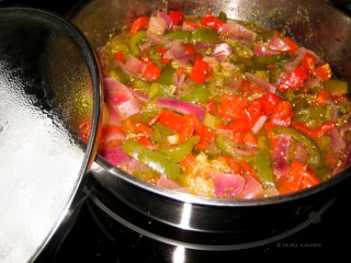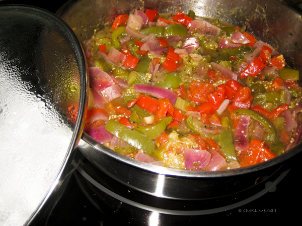 Meanwhile, the vegetables were stewing on my induction stovetop. A medley of tomatillos, red onion and red and green peppers. I would’ve preferred poblano chilies, but we were out. In my burning interest in cutting calories, I replaced the usual oil with chicken broth to prepare my veggies. To spice it up, I used a generous helping of freshly ground black pepper with citrus bits and cilantro paste. Both seasonings are commercial products by ‘McCormick’ and ‘Gourmet Garden’ respectively. I can highly recommend both, as well as other ‘Gourmet Garden’ preparations, like ginger and garlic pastes, for ease of use and solid flavor. I use the cilantro paste especially eagerly because I detest chopping fresh cilantro. It clings to everything with a vengeance, scissors, dishes, knives, skin, cutting boards, countertops, you name it.