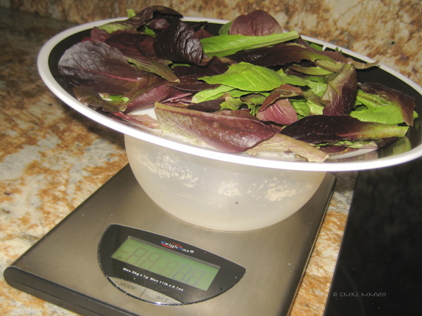 Two posts ago you saw a small mountain of shredded radicchio dominate a low-calorie fish plate. Today you’ll encounter Rouge d’Hiver and green mache salad greens as a base for a well rounded and tasty chicken dinner. Anyone not currently dieting is free to stick with the delicious Parmigiano Penne Pasta that Barry got, may he be cursed – just kiddin’! Everything needs to be calibrated, of course, including the greens: 1 oz of lettuce for less than 5 calories are a tasty noodle replacement. Your hips will thank you 🙂