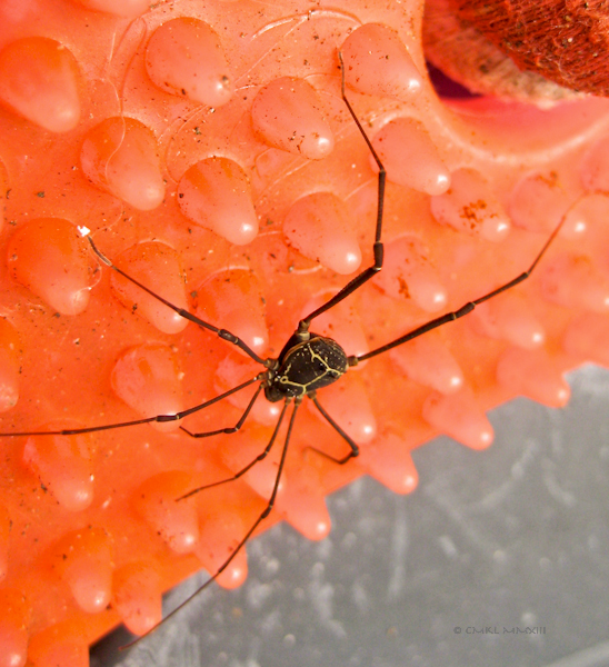 I came across this spider-look-alike today. Eight legs, but there the resemblance stopped. No clear definition of cephalothorax and opisthosoma. Instead, I saw a bunch of funky kneecaps and legs of uneven length. It, whatever it was, moved very fast and tried to hide in a dog chew toy. It wasn’t easy to see it clearly, let alone to focus a camera on its interesting features. In part, because that little guy was also only about 4 mm wide.Further research revealed my brown and neon green new friend to be a member of the Opiliones order of Arachnida. Not a spider, but a harvestman, or a tropical Daddy Longlegs. Which species is much more difficult to determine, if you’re a layperson since there are about 6500 from which to choose. I’m thinking, he – judging by the carapace it’s a ‘he’ – might be a member of the Zalmoxidae family … possibly a Pachylicus spinatus.