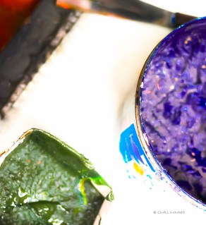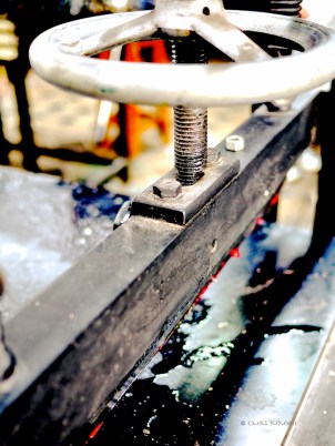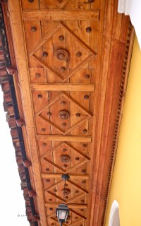 I was bending backward, literally, to take a picture of decorative soffits lined in tropical woods, when Barry called me over to an arched doorway. Through the opening, barred by a mesh-lined wrought iron gate and flanked by carved double doors, we barely made out a taller, a workshop of some kind. It was nearly impossible to identify details, because of the sharp gradient of glaring sunlight in the street and soft darkness within. We were trying to determine the type of craft practiced in this place, peering rudely through the screen, hands shading eyes, heads twisting side to side, trying to find a better angle to catch a glimpse of the interior, thinking meanwhile, those objects could be old-fashioned printing presses. Our obvious intrusive behavior didn’t go unnoticed inside and an inquiry ensued. Our guide Edwin explained – gringos locos, no doubt – and permission to enter the premises was granted. A different door just a few steps up the street opened for us and we entered a high-ceilinged space, dimly lit by the doorway, through which we had spied from the street and another one opening toward an interior gallery and a courtyard. A few neon bars overhead helped to illuminate a large workspace, cramped with several printing presses, deep work tables, shelves and container units, stools, buckets, file cabinets and a water dispenser. Looking in from the street, I never thought to take a picture, which would’ve been technically questionable anyway, but after asking permission, I began to record the space before us.