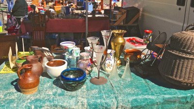 We try to ignore wet weather pretty much, so last Sunday we combed through an amazingly huge flea market event or ‘Brocante’ in the parking lot of an industrial park in the outskirts of town. Even though it only rained intermittently, it was pretty darn blustery, bone-chillingly so at times, but fun nevertheless. I didn’t dare take any more pictures after these two when an exhibitor tried to have me arrested for industrial espionage. Ils sont fous, ces Gaulois!
