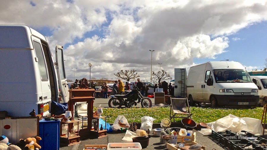 We try to ignore wet weather pretty much, so last Sunday we combed through an amazingly huge flea market event or ‘Brocante’ in the parking lot of an industrial park in the outskirts of town. Even though it only rained intermittently, it was pretty darn blustery, bone-chillingly so at times, but fun nevertheless. I didn’t dare take any more pictures after these two when an exhibitor tried to have me arrested for industrial espionage. Ils sont fous, ces Gaulois!
