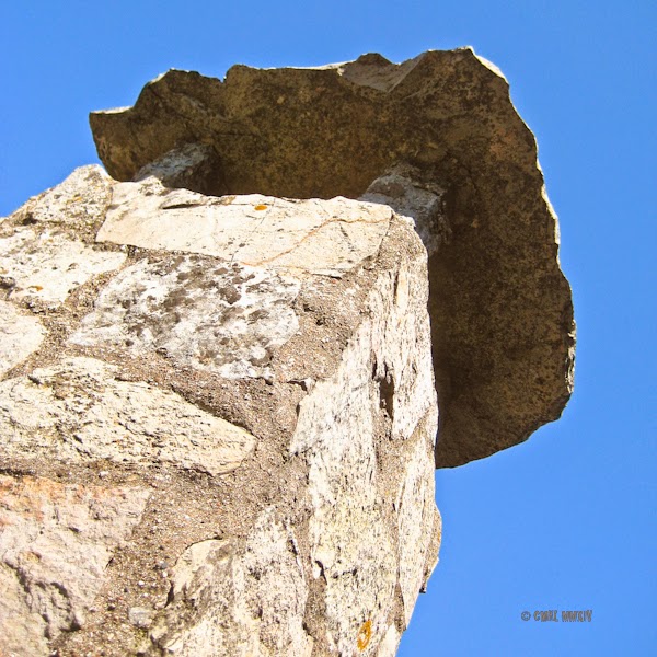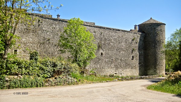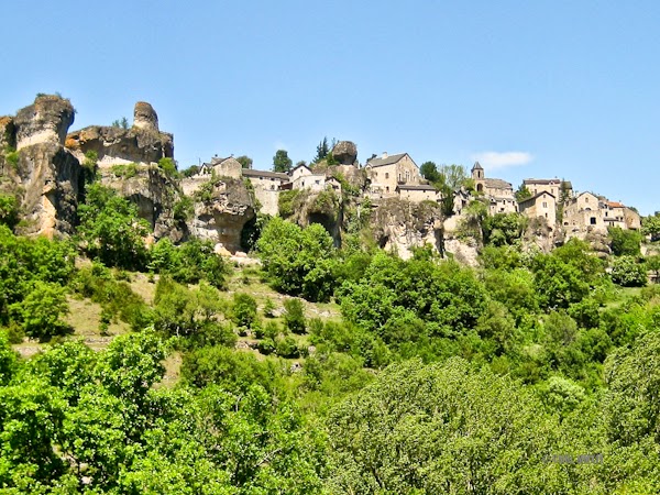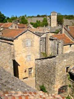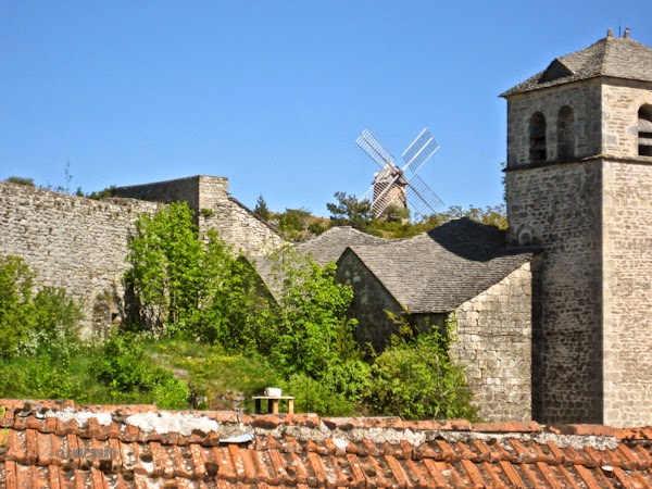 Shortly thereafter we picked up D55 in Nant, swiftly climbing up on the Causse du Larzac on our way to Couvertoirade. The mountain ranges out of which the Massif Central region is composed have a number of high plateaus. All in all, there are nine named plateaux or ‘causses’ and the Causse du Larzac is one of them. The Larzac plateau is a windswept limestone karst landscape with very little surface water. Having lived in Central Texas on the Edwards Plateau, we’re quite familiar with the lack of surface water. Only here, despite the paucity of water, everything is so much greener than in Texas, at least in Spring. The main agricultural endeavor on the Larzac plateau is sheep farming. Mostly Lacaunne sheep are raised here to produce the world famous Roquefort cheese. Only cheese made of lait de brebis (ewe’s milk) and aged in one of the ancient Cambalou caves of the town of Roquefort-sur-Soulzon in the Aveyron is by law allowed to be labeled ‘Roquefort’ cheese. But since I don’t much like blue or green cheeses, we might as well move on to the black and grey stone village of Couvertoirade.