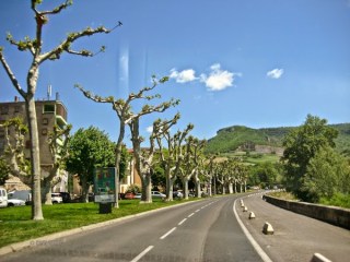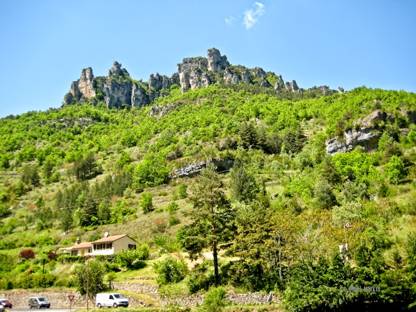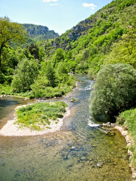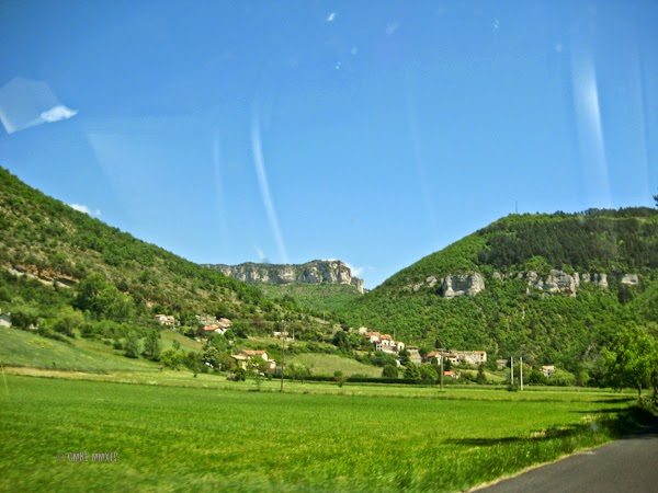 After our visit at the ‘Maison de Parc’ (park headquarters) of the Grands Causses national regional park, we left Millau, driving along the Dourbie river on a small, two-lane road, D991. Road and river meander jointly deeper and deeper into the southern reaches of the Massif Central, a group of mountain ranges of volcanic origin. Here in the South, the Massif Central is composed of four major ranges, the Cévennes, the Monts de Lacaunes & L’Espinouse and the Montagne Noire, the Black Mountain. These are wild and woolly regions, which until very recently were considered remote and forbidding. The new highway A75, La Méridienne, with its spectacular bridges, now connects Clermont-Ferrand, where Vercingetorix defeated Gaius Julius Caesar’s occupational forces in 52 BCE, with the Mediterranean coast, finally allowing easier access. Might have offered Gaius Julius a chance to bring in more troops!
