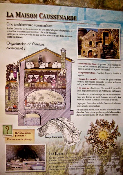 You can also read a description of a ‘jasse’, a dry stack stone shelter for sheep out on the plateau, which also includes a cistern to collect rainwater for the animals and shepherds. And the famous ‘cardabelle’ (Carolina acanthifolia) is shown as well. These thistles grow wild on the limestone ground of les causses and were called ‘shepherd’s barometer’ since they open in bright sunshine and close up when rain is on the way. Cardabelle thistles are related to artichokes, so part of the bloom is edible, while the thorny portions can be used to card wool. I read they also have certain medicinal properties AND protect against the evil eye, which might be the reason, why you see cardabelles on many doorways all over the Languedoc.