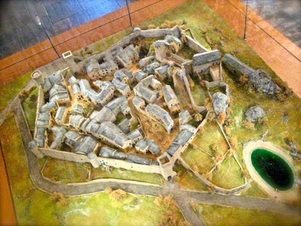 | this model of the village on display in the gift shop shows the layout quite well – the pond used to be in the teardrop-shaped space near the bottom watchtower |