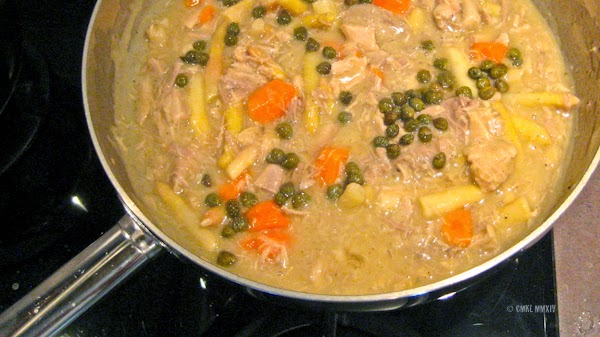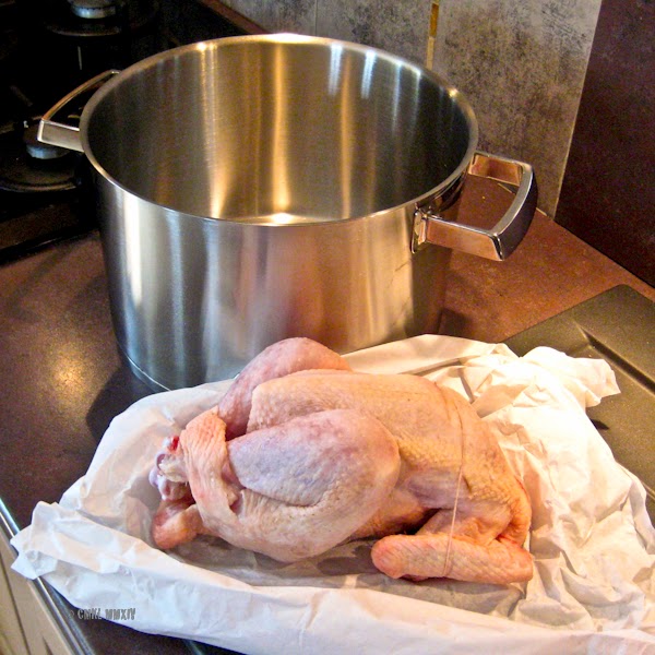 Cook the chicken gently for a couple of hours, then take the meat off the bone.