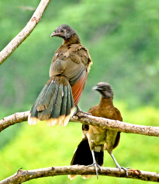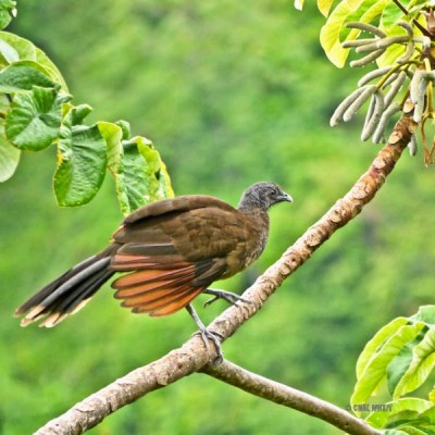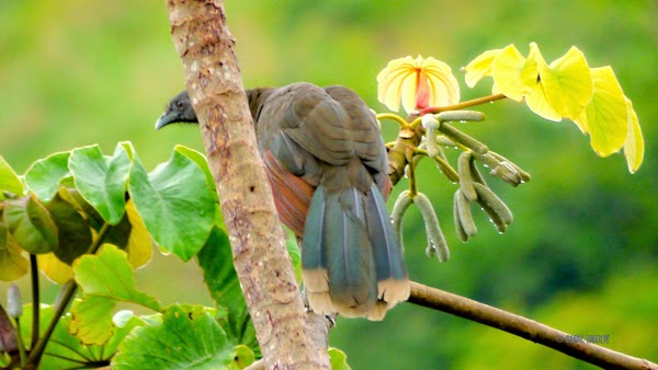 It took me a while to determine their identity. The grey heads and chestnut primaries finally lead me to Graukopftschatschalaka, otherwise known as Grey-headed chachalaca, Ortalis cinereiceps. Chachalacas do belong to the chicken order, but contrary to most Galliformes, they’re tree dwellers and rarely come down on the ground.