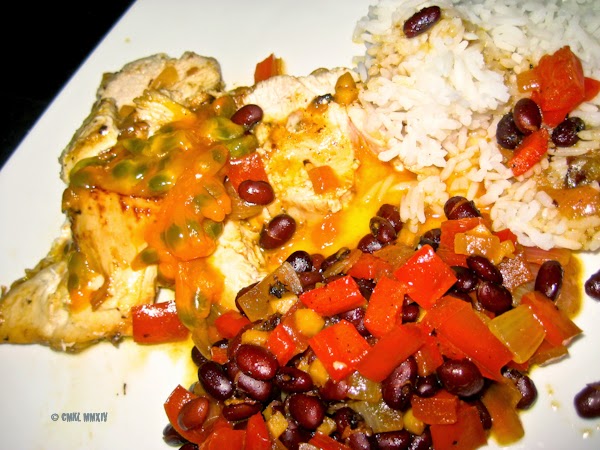 Slice the chicken and serve with the vegetables over rice. If available, drizzle some fresh maracuyá seeds (pulp) over the meat.