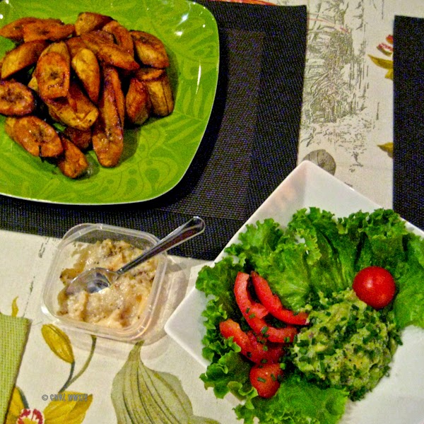 | fried, ripe plantains, baked garlic spread and avocado salad |