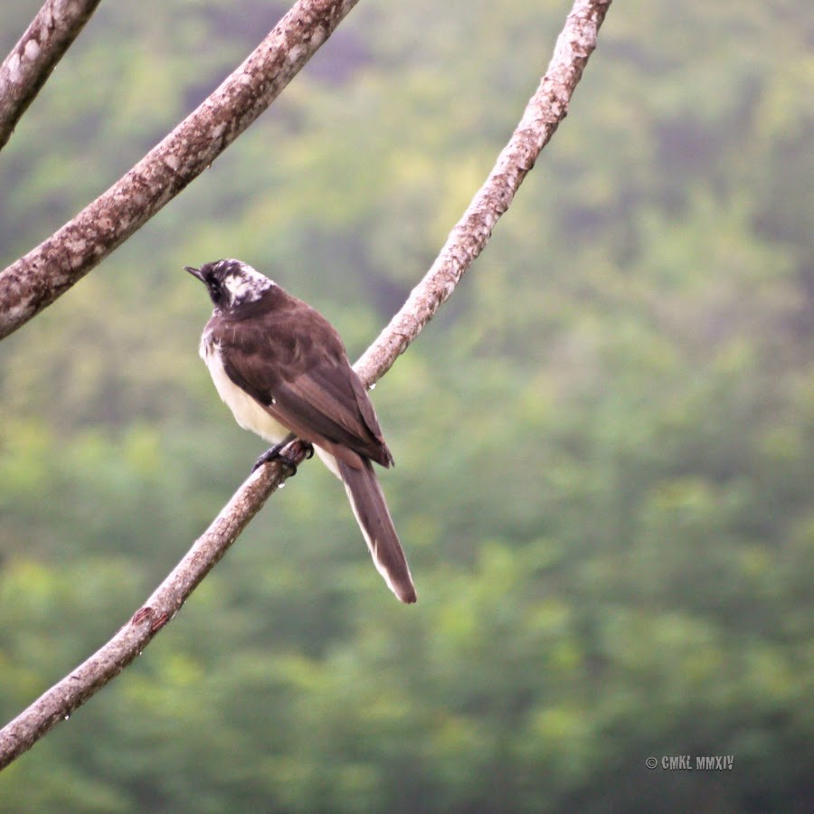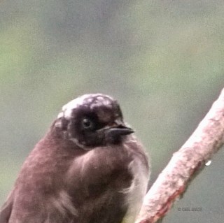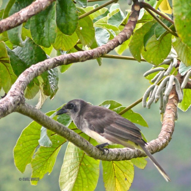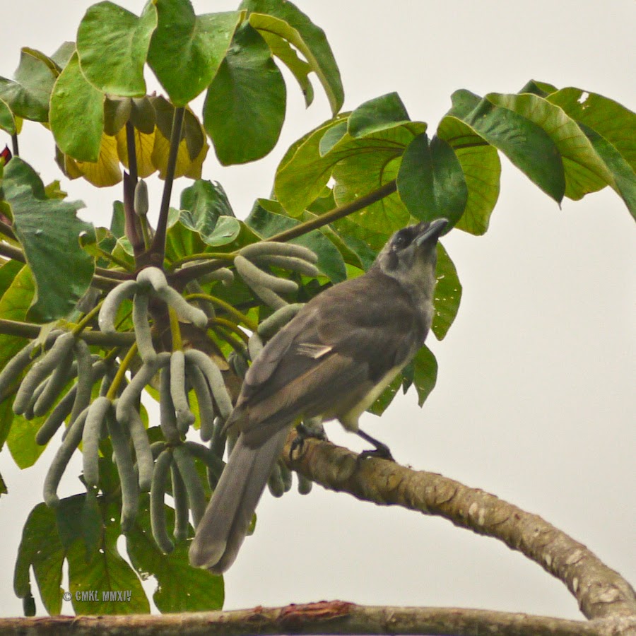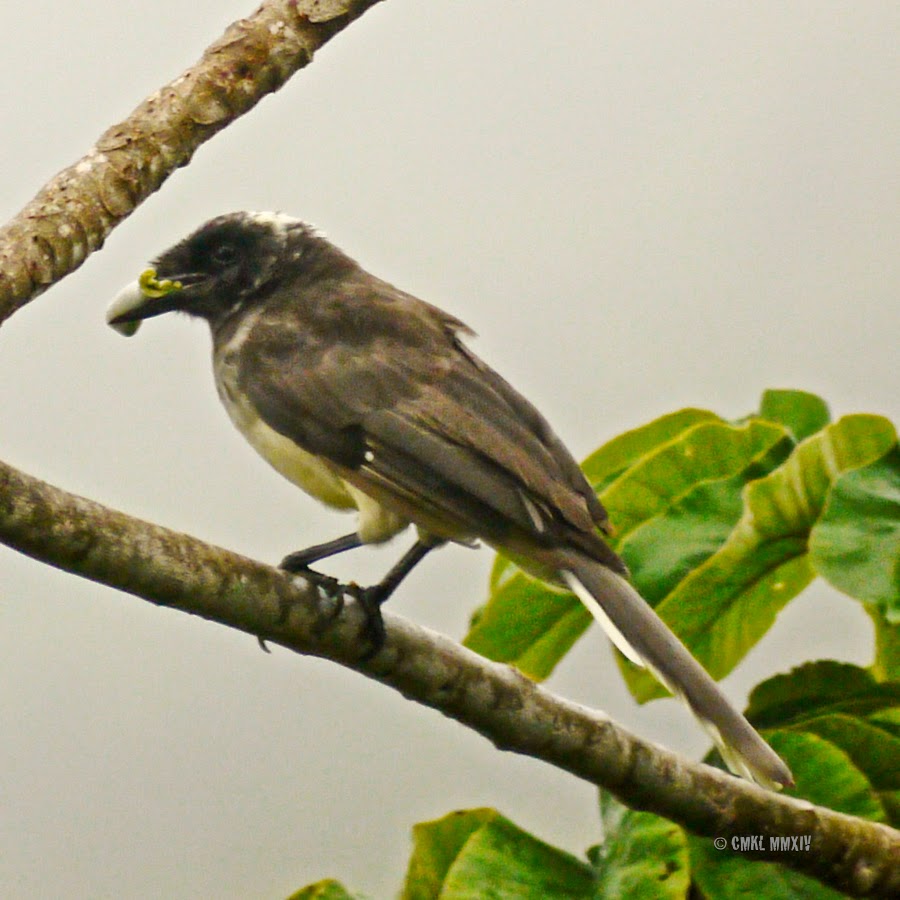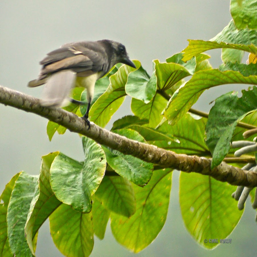 The following day another flock of birds chose the foggy late afternoon to settle in the guarumo for a quick snack. A noisy group of several generations of the southern variety of Brown jays (Psilorhinus or Cyanocorax morio). I identified two separate juveniles by their beak & gape flange pattern, who shared the tree with several adult jays.