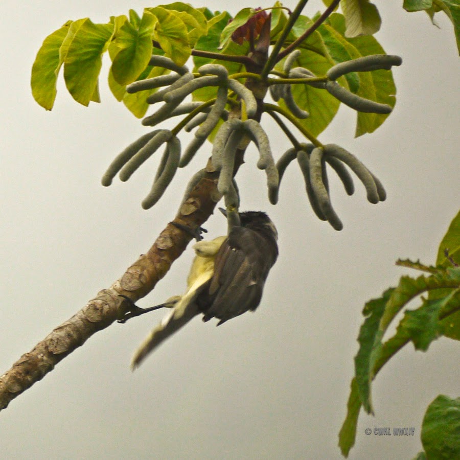 Hence these pictures of a small flock of oropendolas having a snack in a much closer guarumo, or, as he knows them, Cecropia.