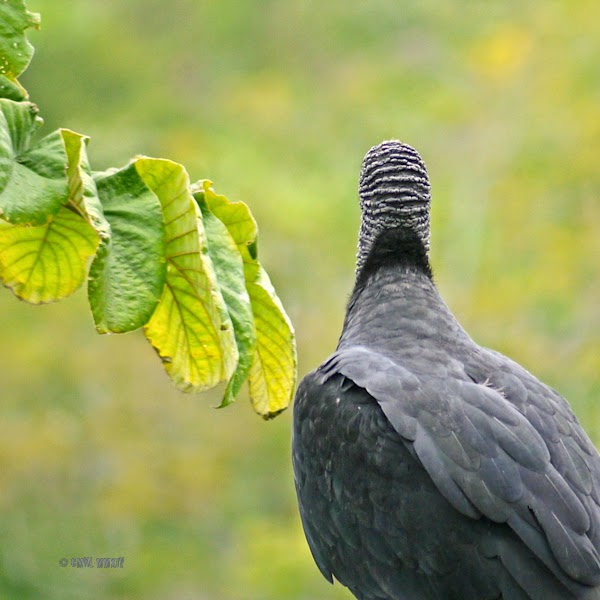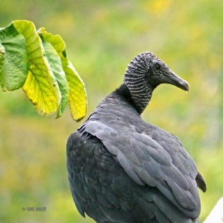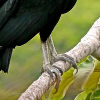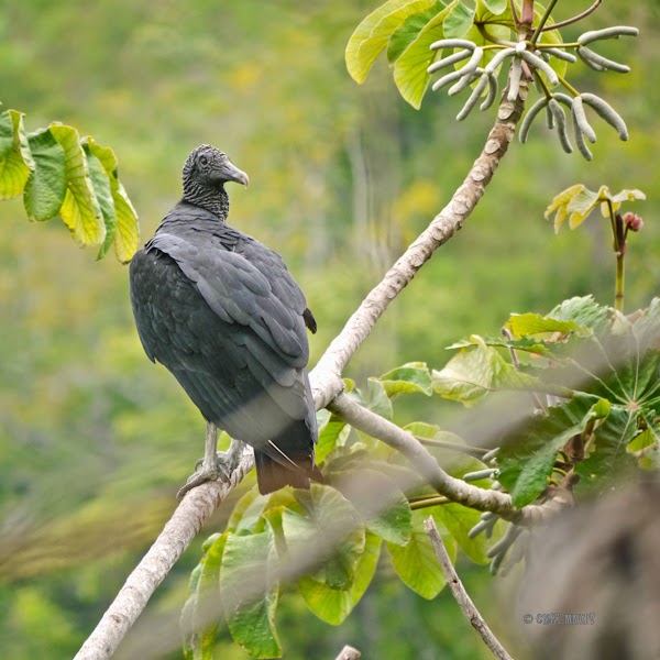 A small vulture with a wingspan of under 1.5m or 5 ft, it is often still classified with storks and looks like a stern judge, at least to me. Black vultures soar above our hills all day long, gliding in and out of the canyons around us. One of them needed a little rest this afternoon and settled on a branch of a guarumo behind my office. I heard this heavy duty flapflapflap like helicopter rotor blades coming to a stop. Turning my head toward the sound, I saw the tired vulture quietly sitting there. Coragyps don’t have a syrinx, so they can’t vocalize much beyond hissing.
