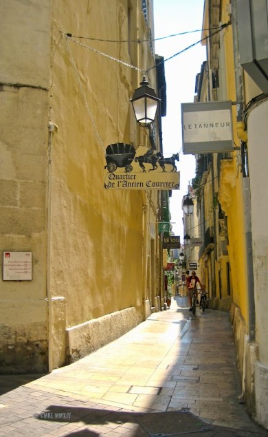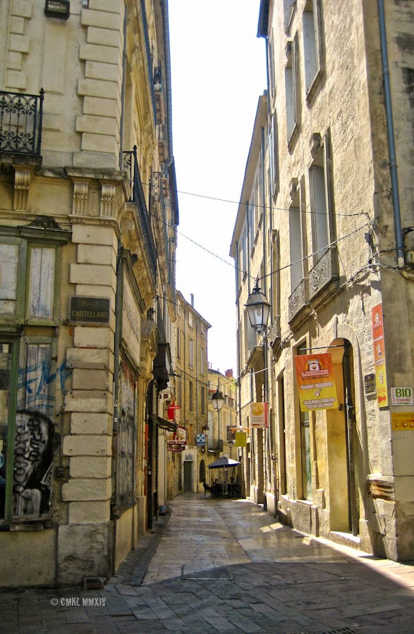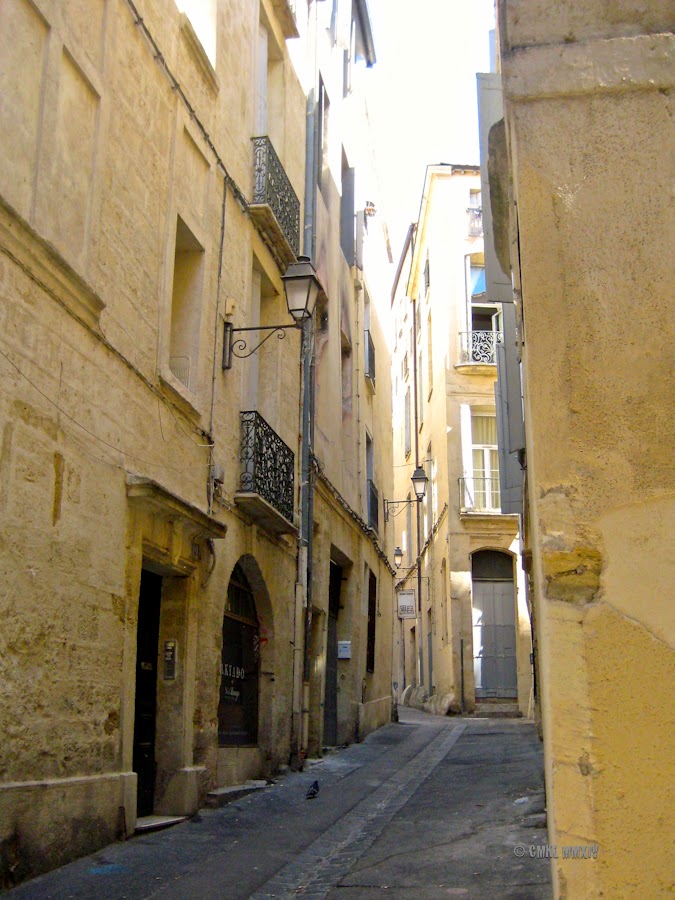 There are so many impressions to process, it boggles the mind. The general atmosphere enriched with thousands of details, like the small banner in the middle of the alley above for the ‘Maison de Heidelberg’ a German cultural center maintained by one of Montpellier’s eleven sister cities, Heidelberg. I wouldn’t have noticed the sign, but for its tiny German flag.