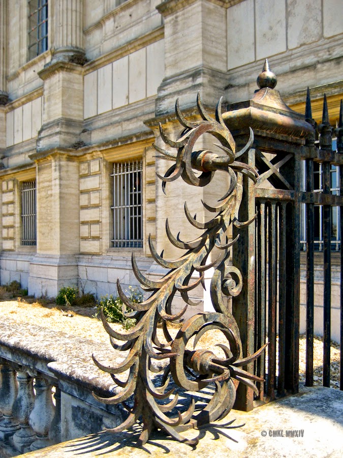 Where were we? Yes, we just left l’écusson, the ancient center of Montpellier, thus named because it is shaped like an écusson, an escutcheon or heraldic crest, and we’re walking along rue Foch, passing the neoclassical buildings of the Palais de Justice, the court house, currently housing the Court of Appeals, itself well protected by intricate, period iron work.