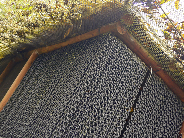 One enters a small foyer to the aviary through this chain mail curtain of heavy plastic. Should a bird manage to fly through a door left open, this curtain will discourage any escape artist, without hurting it.
