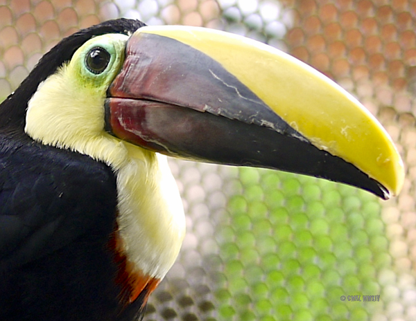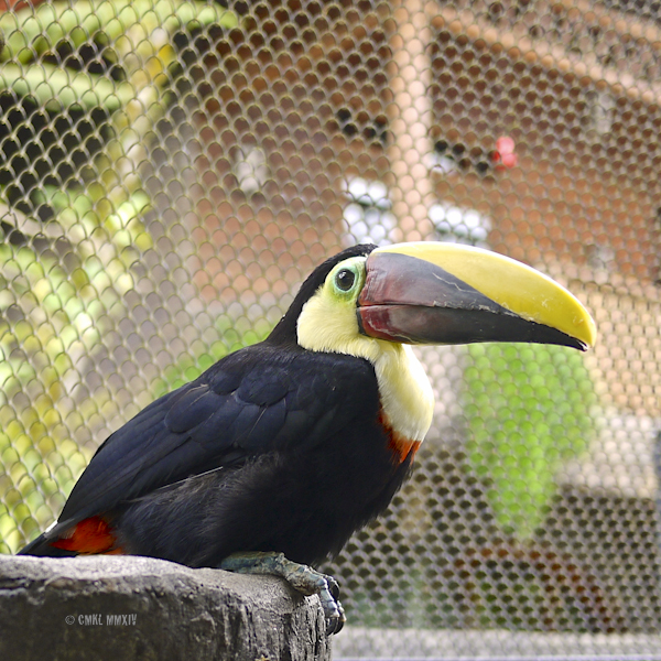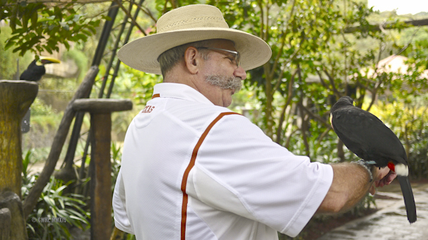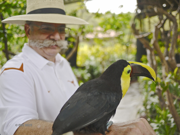 The chestnut-mandibled toucans are a little larger than our local keel-billed toucans. They’re more easily hand trained while the keel-billed toucans are notoriously shy. These toucans are so popular that even other birds look in through the fencing