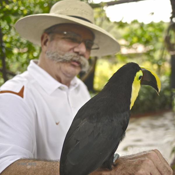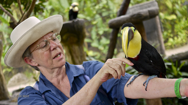 I imagine, this is a younger bird, possibly a female, which is very difficult to tell in toucans. Her keeper said sometimes they have to do DNA testing, to be certain. She readily climbed from her keeper’s arm onto Barry’s.