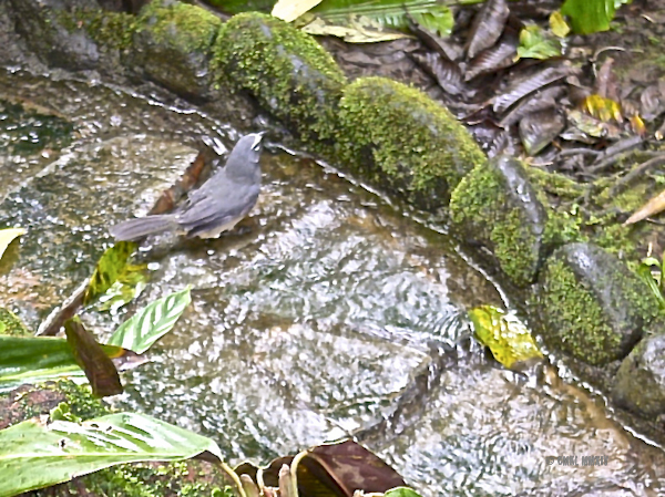 Like this Greyish Saltator (Saltator coerulescens), which was barely visible on the wet stones. Or the Black Guan (Chamaepetes unicolor) in the following picture, so perfectly hidden in the tree.