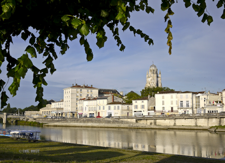 Looking at Quai de la République from across the Charente river, with la cathédrale Saint-Pierre de Saintes looming over our house.