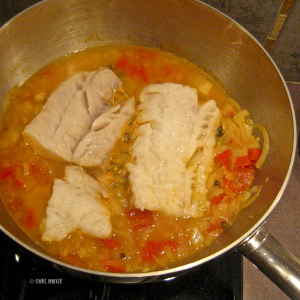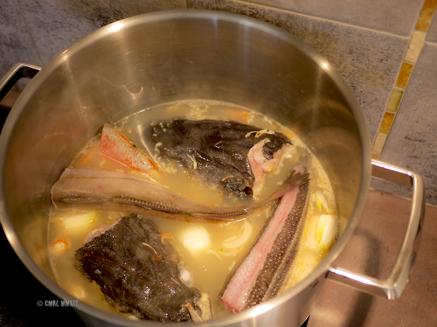After shelling and beheading the shrimp and cleaning the fish, I dumped all the exoskeletons and heads with some aromatics in cold water and let the whole mess come to the boiling point, at which point I added two store-bought flavor gobs, may Ms. Child forgive me, placed the fish in the stock and let it simmer on very low for an hour.