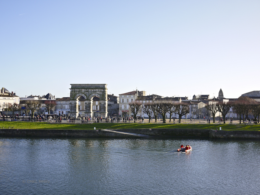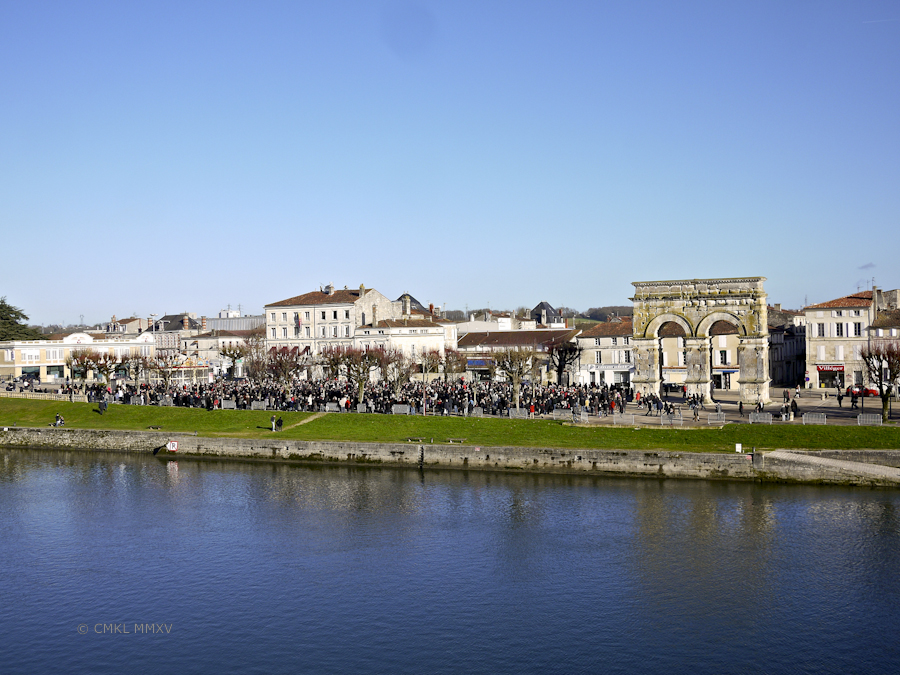 Firefighter units patrolled the river, while people congregated in a quiet and orderly fashion. I have no idea how many joined the assembly for unity here in Saintes, but it was quite a crowd, standing respectfully to honor the memory of the slain.