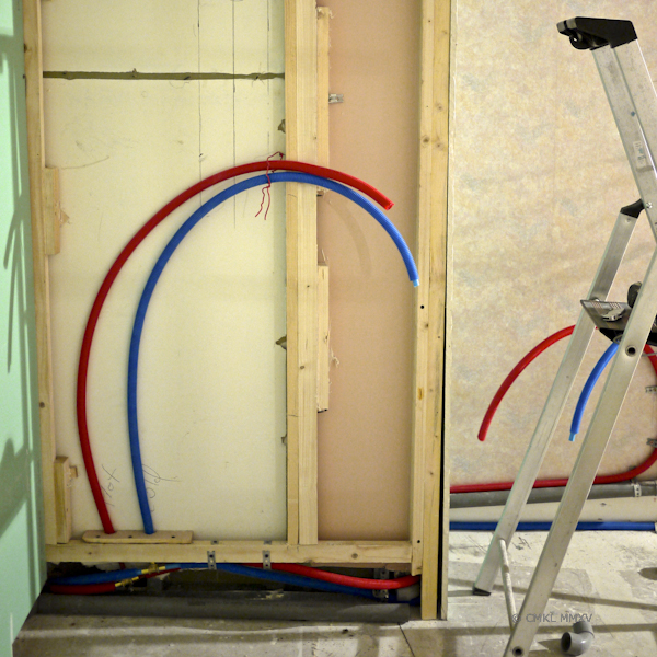 By then, we were well into February with our renovation, but the pressure was off to some degree for us because mom, sadly, had had an accident which made transcontinental travel inadvisable for her for the time being. Meanwhile, the shower stall took shape – except …