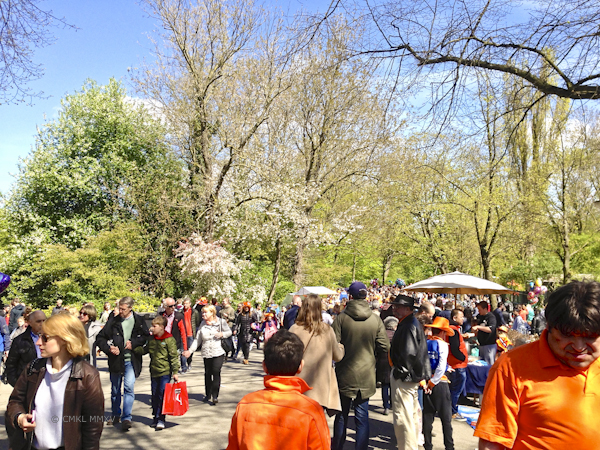 Many children stake out small areas along the meandering walkways and perform or sell used items or serve homemade goodies to the crowd. The spectators then award those efforts with coins tossed into hats on the ground. We watched young gymnasts perform a floor routine to music, a trumpet & guitar duo, and many more. As we were about to leave Vondelpark a boy approached us asking something in Dutch. Hearing our English excuses, he immediately switched to perfect English and asked, if we wanted to hear a joke. Yes, of course! It was actually a pretty good one, but truly astonishing was the ease with which this pre-teen handled a foreign language. It wasn’t a joke that you could translate, it was a word play that only works in English. I wondered later, in how many more languages he might have prepared a joke to tell on Konigsdag.