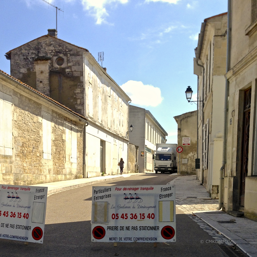 Before we continue toward Cours National, let’s do a déjà vue all over again, ok? When I walked up Rue Saint-Vivien a couple of days later, the whole street was blocked by a moving van with a trailer. A couple of guys were busy unloading someone’s household goods via an external elevator into the house right next to the butcher. The van had to park in the street since there was nowhere else to go. In such a case, the town issues a permit that allows the movers to divert traffic and do their job in peace. Similar to our parking permit along Quai de la République, when we moved in a little over a year ago. Nobody complains, it’s part of daily life in an old town with narrow, twisty streets.