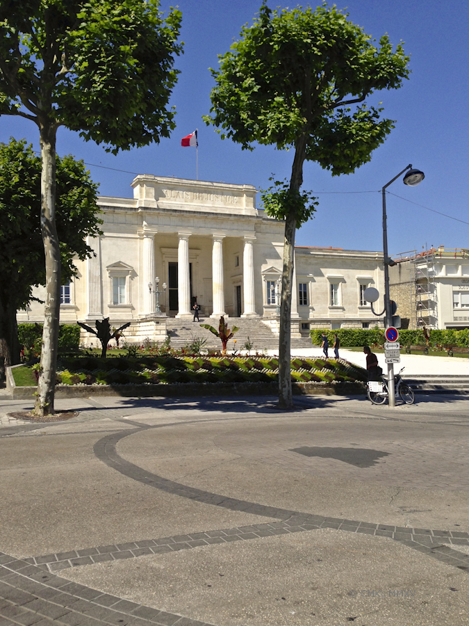 Anyway, after our encounter with the deer late in the last walkabout post, we’re now on the south side of Cours National, our main drag, looking straight at the Palais de Justice across the street and the fabulous landscaping surrounding the courthouse.