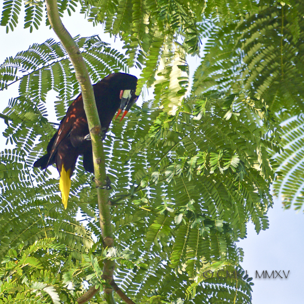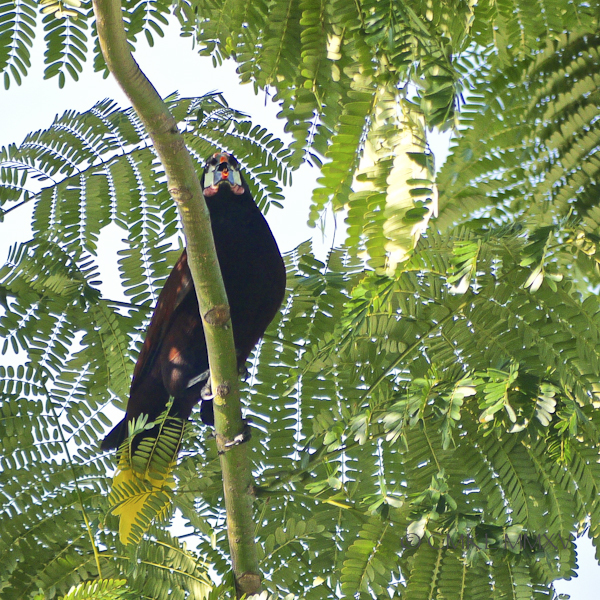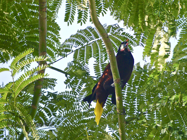 After a while, our morning visitor moved to a different branch where I could observe his display behavior a little better. In order to understand how easy it is to identify oropendolas by their vocalization, you have to listen to their songs just once and all will be clear.