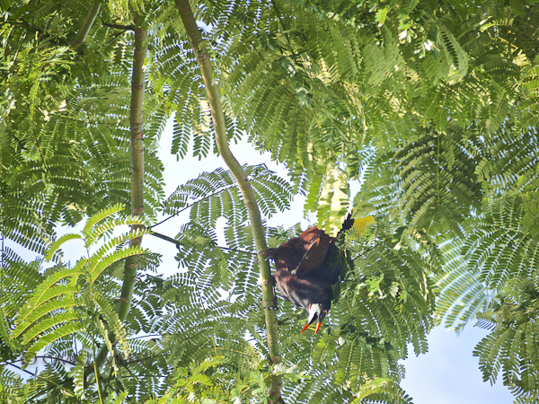 Training the lens toward the oropendola this morning, I was rewarded with a few snapshots showing a solitary male practicing his courting routine. As you can see in the picture above, he likes to hang out near a clump of dried grasses, which may trigger his display behavior. The grass could have been placed there by a female oropendola in an attempt to weave a nest. The long and skinny oropendola nest-pouches are shaped like Christmas stockings and an individual tree may be overloaded with several dozen nests of a breeding colony. Usually, only one or maybe two dominant males sire the entire colony’s offspring. In this very brief video clip, you can see a palm decorated with an abundance of oropendola nests. It used to be down the road from us. Sadly the palm has since been cut down when the pasture was subdivided into building plots. None sold as far as I know.