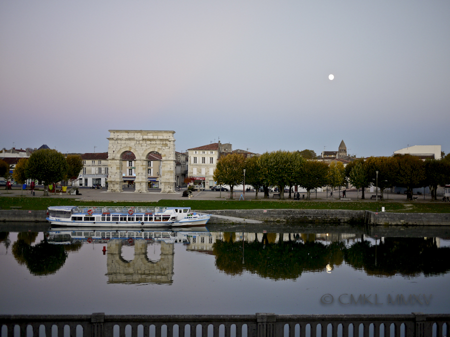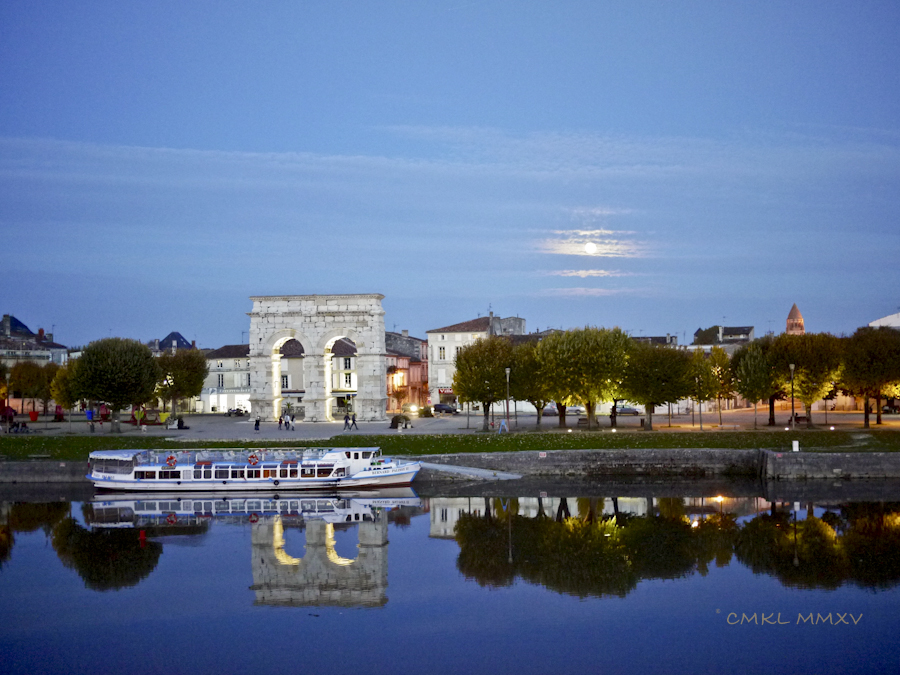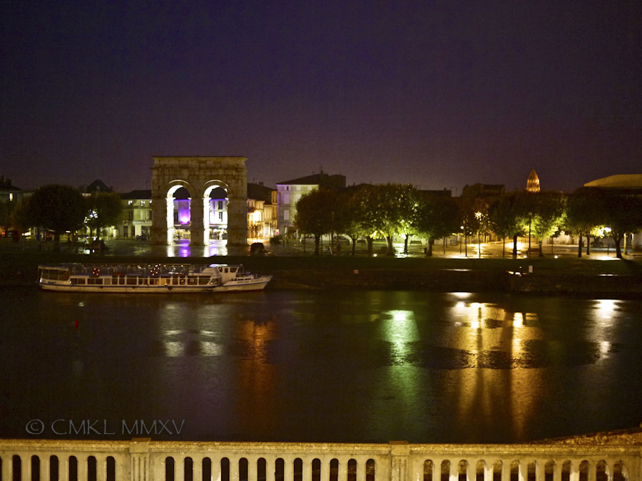 Since it continued to rain into the night, we never did get to admire the full moon, just man-made light reflecting off the wet pavement and creating a continuously changing stained-glass pattern over the dimpled surface of the Charente river. Not so bad, really.