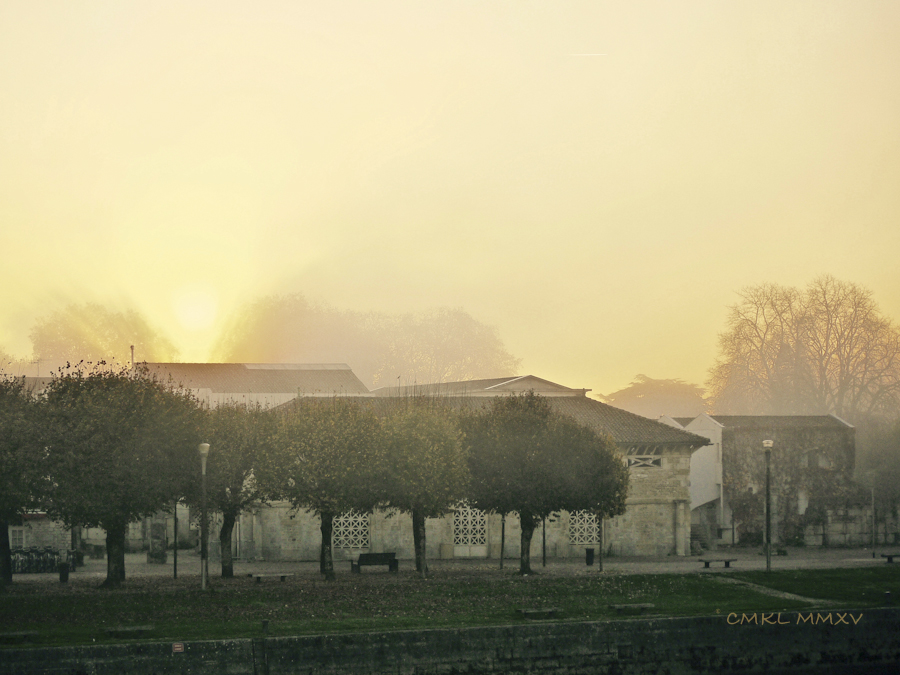Saturday dawned pretty in pink, accentuated by a solitary cormorant passing overhead. As the rising sun backlit the trees and rooftops across the river Charente with ever increasing brightness, mist gathered gently to envelop the landscape in milky fuzziness.
