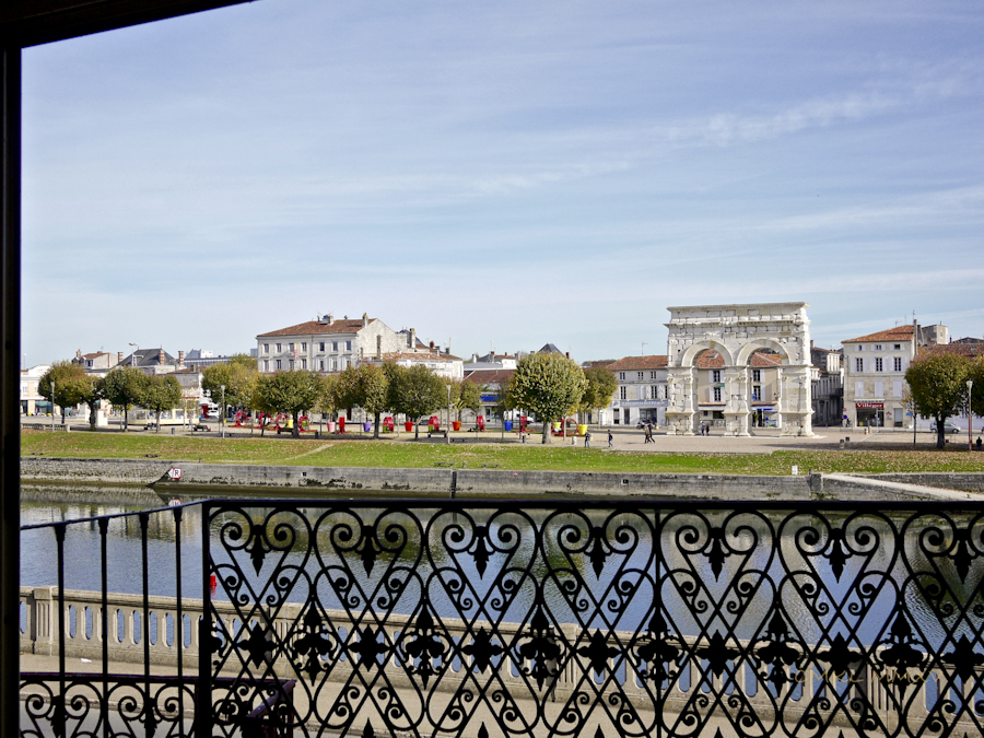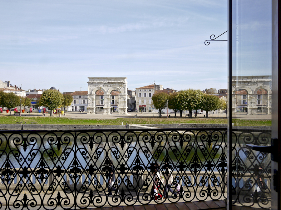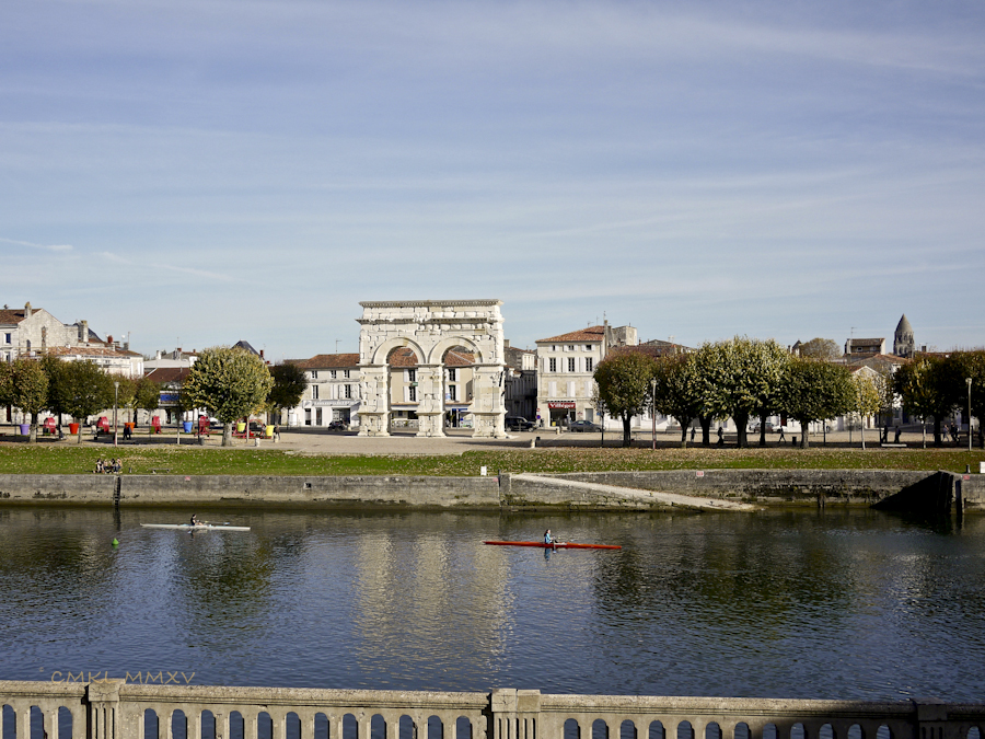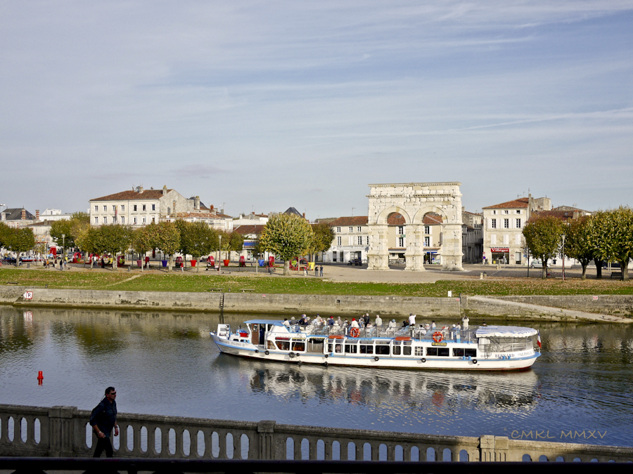 On such a pleasant fall day, one wants to be outside as much as possible. In the afternoon I stepped through that door you see above next to the fireplace and settled with my laptop on our veranda. By folding three glass panels accordion fashion, the veranda opens onto a balcony overlooking the river – a perfect spot for people & boat watching in comfort, even though it is a little noisy. Living as centrally in town as we do, offers many advantages and conveniences we greatly enjoy, especially reaching most destinations on foot and being part of the historical heart of our town. But it also comes with urban nuisances like traffic noise, sots bawling and the earsplitting screech of underpowered & over-revved motorcycles. However, combined with little girls exulting in the speed of their pink scooters flying along the smooth sidewalk of the Quai de la République below our balcony, swans floating by on the river with their cygnets and pigeons cooing from rooftops, all of this together forms the grand amalgam of our life in Saintes.