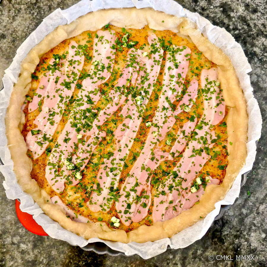 After spreading the bacon across the mustard-smeared pie bottom, I had some bacon slices left over. I laid them along the dough’s edge and folded the dough over the bacon. Turned out quite tasty. The rest of that particular pie consisted of just a thick layer of tomatoes and a persillade with lots of garlic.