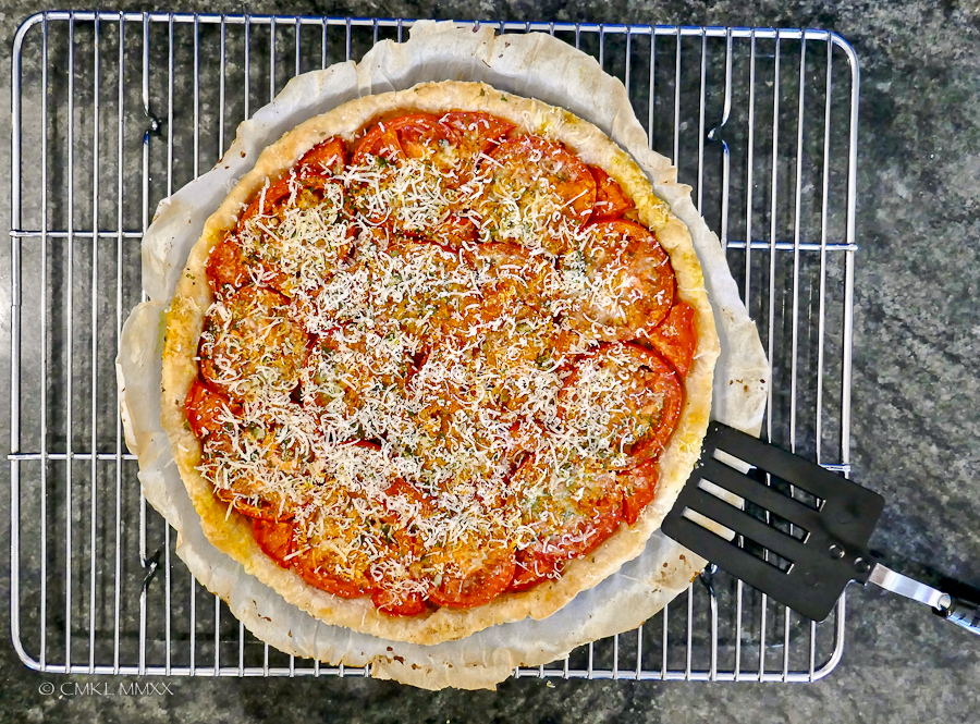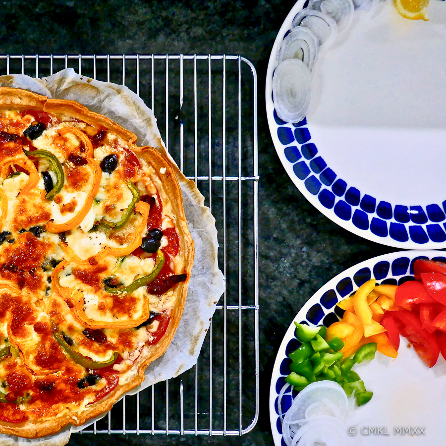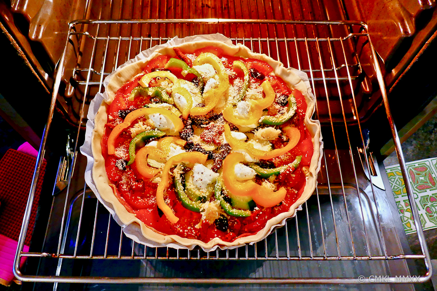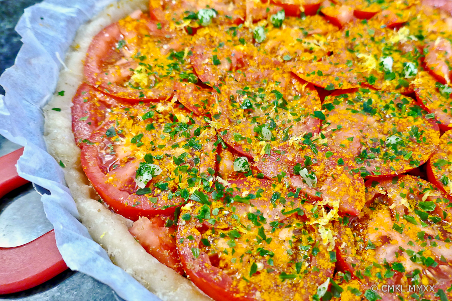The vegetables listed above are just the ones I used, any combination of tomatoes with green, yellow, and black would please the eye and palate. Equally, the Canadian bacon happened to be on hand, other cured meats would work just as well – or none, although for us omnivores, the bacon adds a nice smoky-salty aspect to the pie.