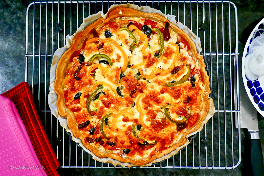 The more recent tri-color pie one the other hand was a robust short-crust dough filled with zucchini, yellow and green sweet peppers, black olive bits, and tomatoes. Upon reflection, I feel compelled to rename it to: