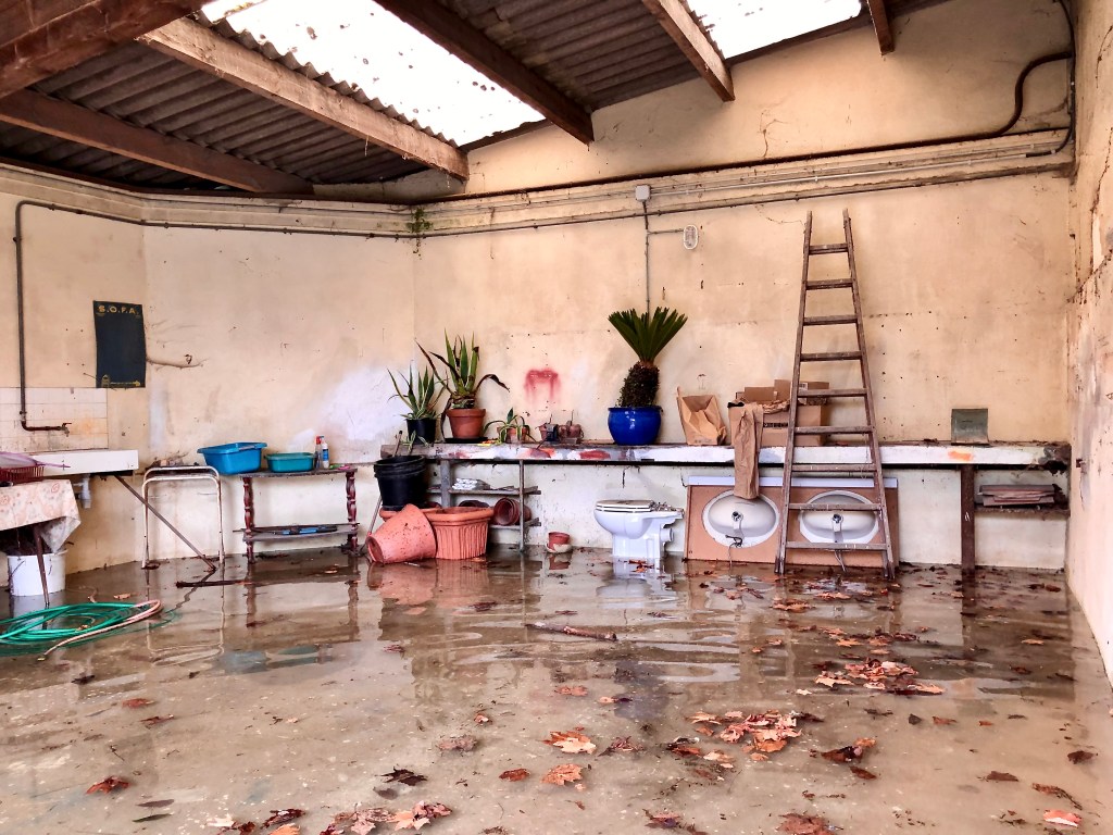Just like the last time when we had a bit of a flood, about two years ago, the drainage grid across the driveway acts as a barrier. Behind the cypress-like, tall evergreen in the upper right corner of the picture above, is a barn we use as a garage for our Renault. Last time, I removed the car while the water was still passable and parked it behind the house. This time, I slept a little too late and the water is already too deep to cross safely. We are hereby stuck at home. No worries, right? Last time, the high water lasted barely 24 hrs. But by late afternoon today, it became clear that this flood is going to be different. Flood levels continue to rise steadily and water is beginning to wet the concrete floor in our gardening shed.