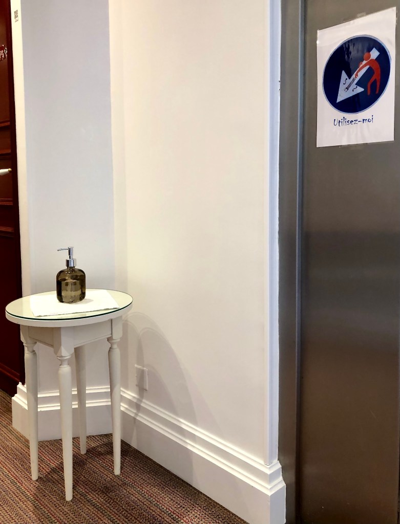 Checking into a hotel during a pandemic was a weird and scary situation. The receptionist resided behind a large acrylic shield, pump-bottles of gel hydroalcoolique inviting a quick rub of the hands were distributed every few meters and a one-way-guest-circulation system was achieved through an elevator-up & stairs-down principle. Staircases and hallways were eerily empty …