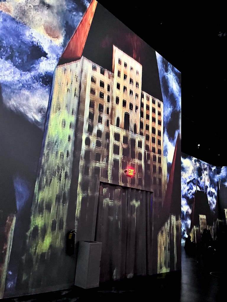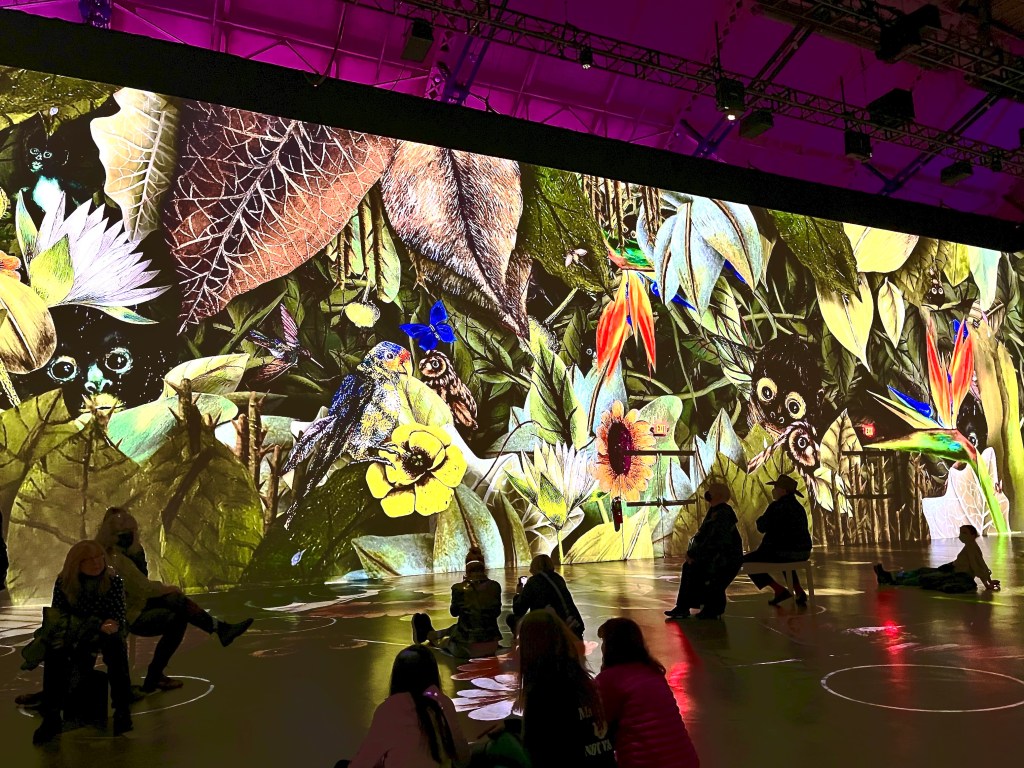 The light, the music, the images, the drama! It was definitely Frida! The show was at first disorienting and puzzling to me, largely because it was presented in an endless loop and I had no idea what I was looking at, or better, into which station of Kahlo’s life I was immersed. Gradually some clarity and harmony evolved, although I’d venture to say, unless one happens to be familiar with Kahlo’s life, its political connotations and romantic convolutions, the immersion would have remained a riveting mystery. My creative side largely depends on visual sensory input, so I hugely enjoyed the textures, patterns, and the vivid colour palette of the show.