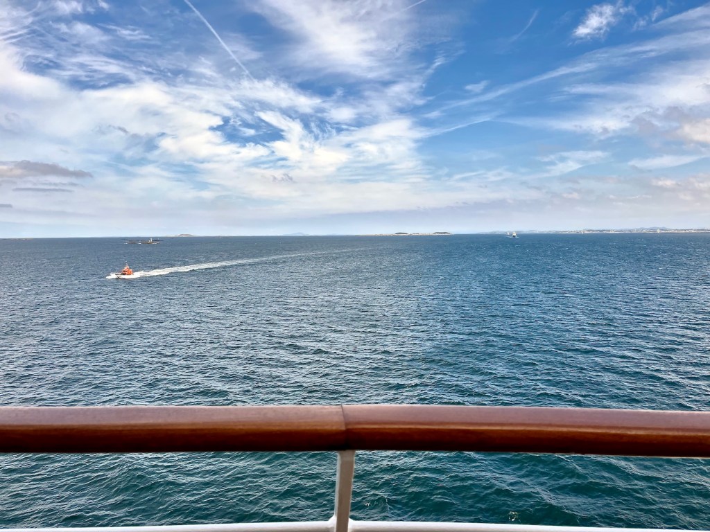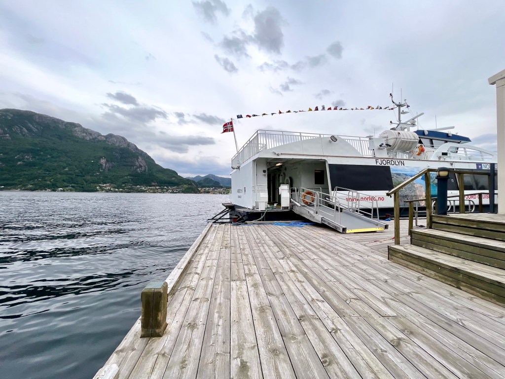 Owing to my gimpiness, we had to choose the most sedentary excursion on offer for the town of Stavanger. A trip up the Lysefjord seemed to be just the ticket. To reach the excursion vessel, we only had to walk ~ 200 m on Skansekaien, the pier, along the edge of Boknafjorden, home of the Port of Stavanger. Easy as pie, right? Not quit, actually. Gangways especially tend to be angled, sometimes sharply, often slippery – anything uneven was a challenge on this first day out after my accident in the UK. But eventually we made it aboard the ‘Fjordlyn’ and found seats up front in the large seating area.