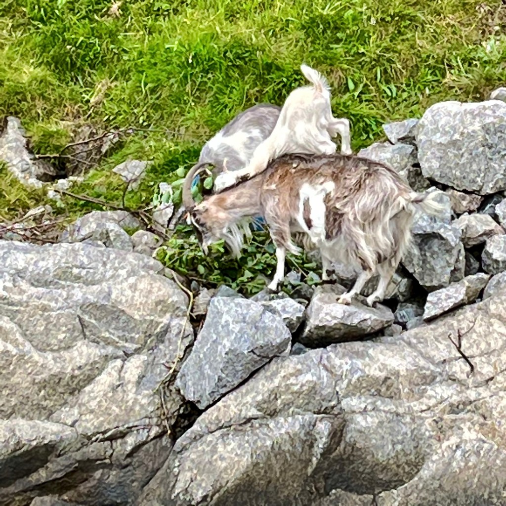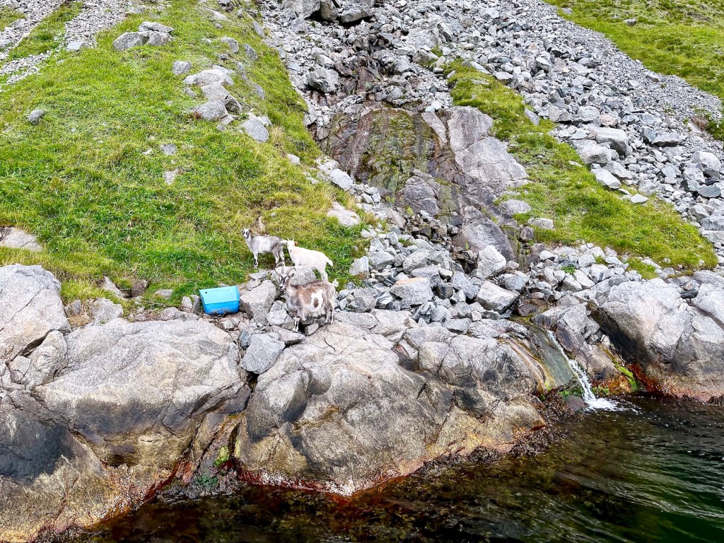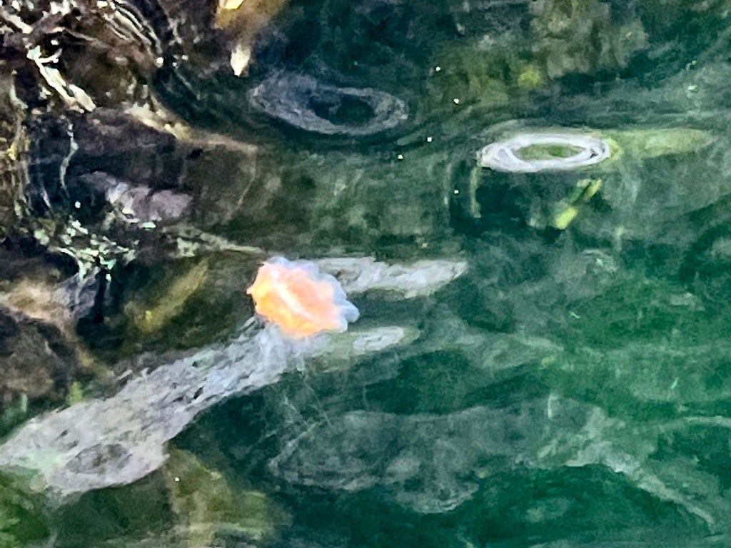 While we were all enthralled by the goats that graze during the summer months on communal land, for which they have to be transported in and out by boat, I noticed several orangey, fuzzy blobs in the water. Jellyfish? Indeed! As bad as these zoom pictures are, they helped me nevertheless to identify the blobs as Lion’s Mane jellyfish, Cyanea capillata, Cyaneidae, Cnidaria – true jellyfish. They are native to the cold, boreal waters of the Artic Circle … just a little lost this far South? They were easy to identify through the eight-lobed architecture of their mantle, giving them a star shaped rather than rounded appearance. Lion’s Mane jellyfish may develop a thousand hair-like sticky tentacles floating about to a potential length of 30 m or nearly 100 feet!!! Those would be fully grown beasts, of course, who can achieve a mantle diameter of 2 m/6 ft, not the babies I saw here with only an estimated 25 cm/10 inches mantle diameter.
