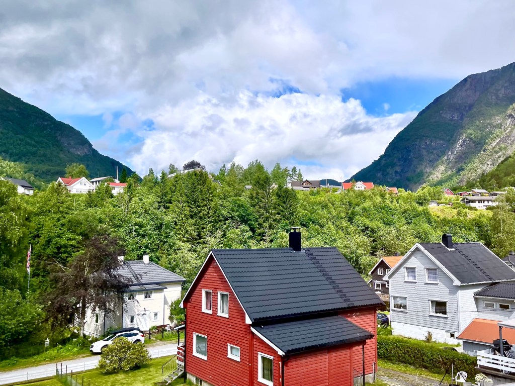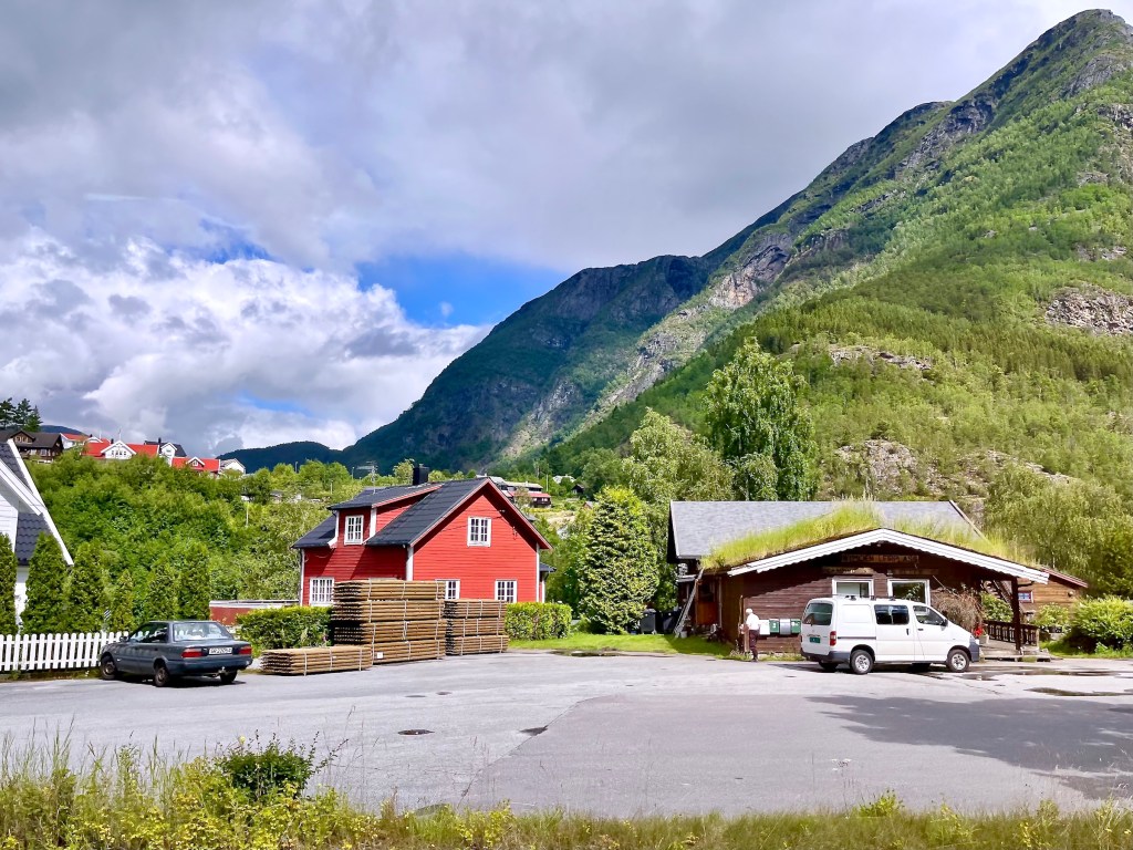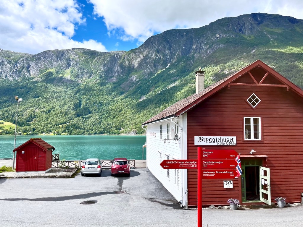 The trip began benignly enough along the Sørsidevegen, the road on the south side [of the fjord] leading into the village past a row of holiday cottages and the Bryggjehuset, the Brewery House pub and café. The road along the fjord soon turned into county road 55 or Sognefjellsvegen [Road of the Sogne mountains], which becomes the highest mountain pass in Northern Europe – open only from May to October.