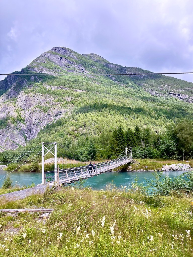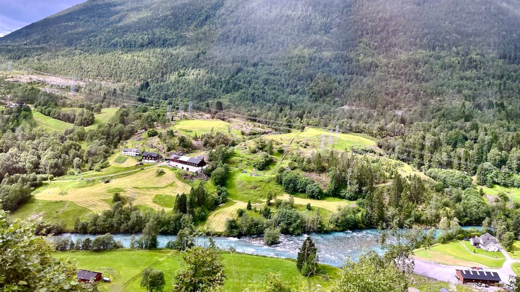 We followed county road 55 through Skjolden, pop. ~250, leaving the fjord behind and continued toward the next village, Fortun, keeping Eidsvatnet, a fresh water lake to our left.