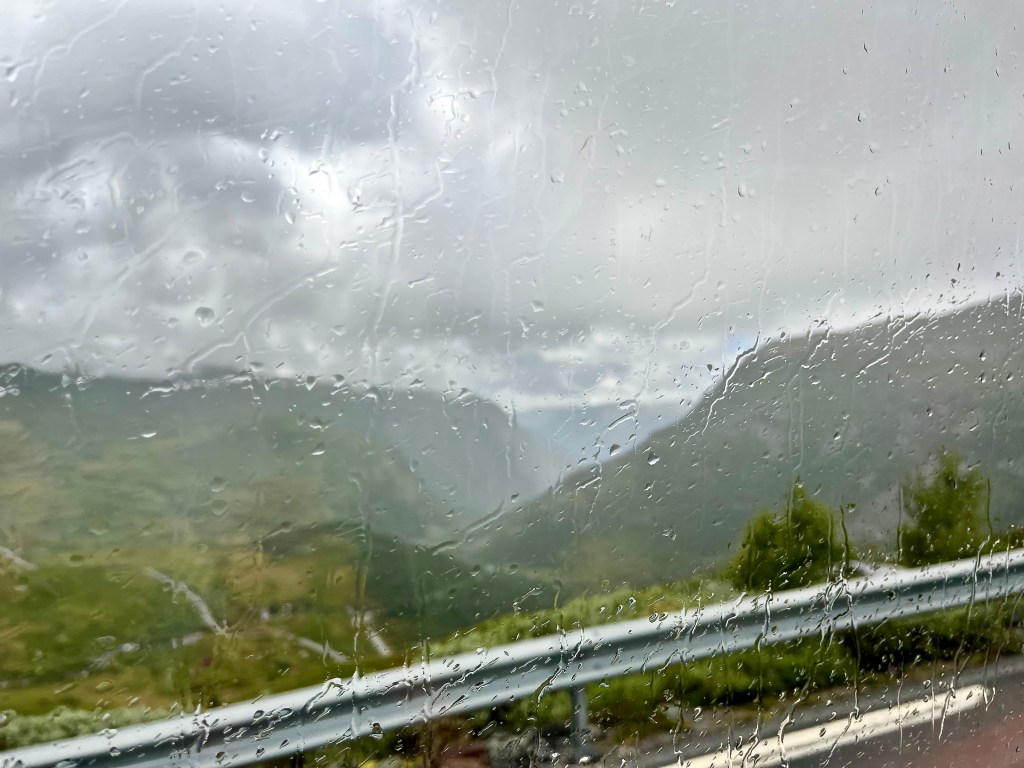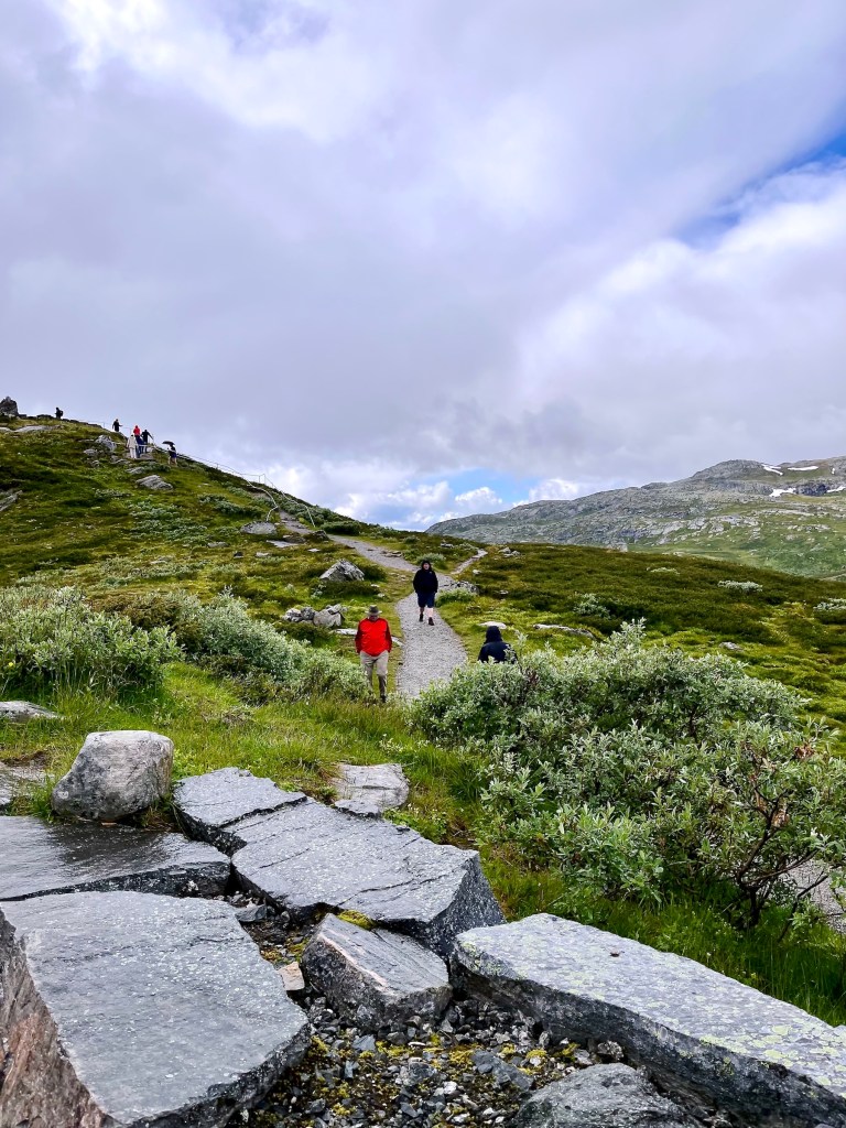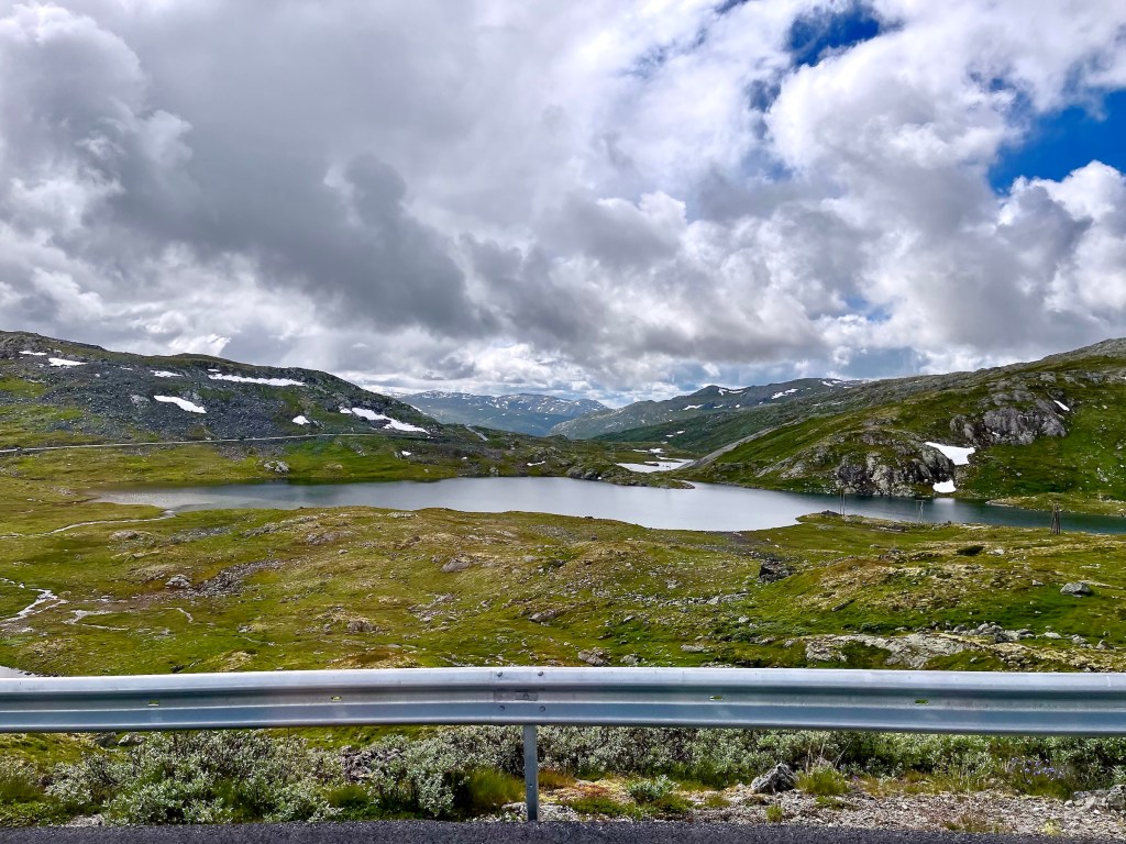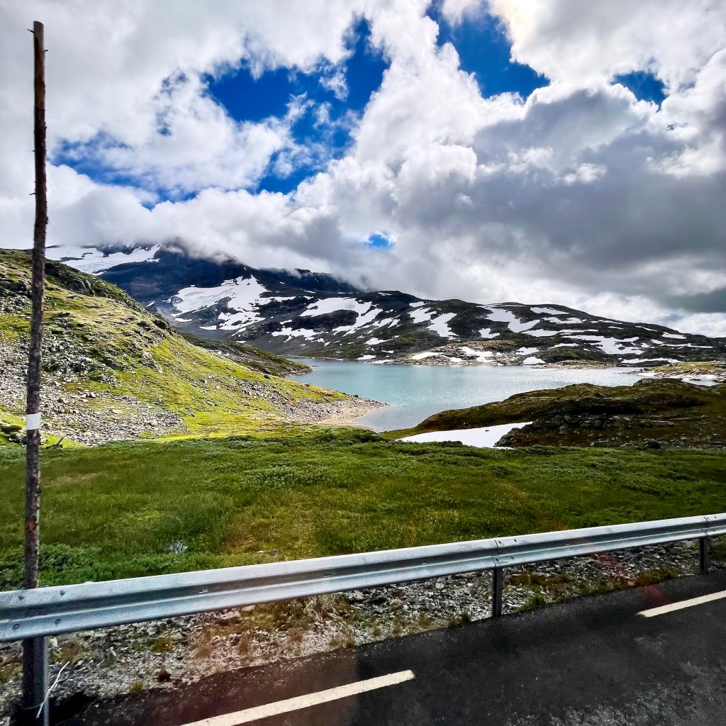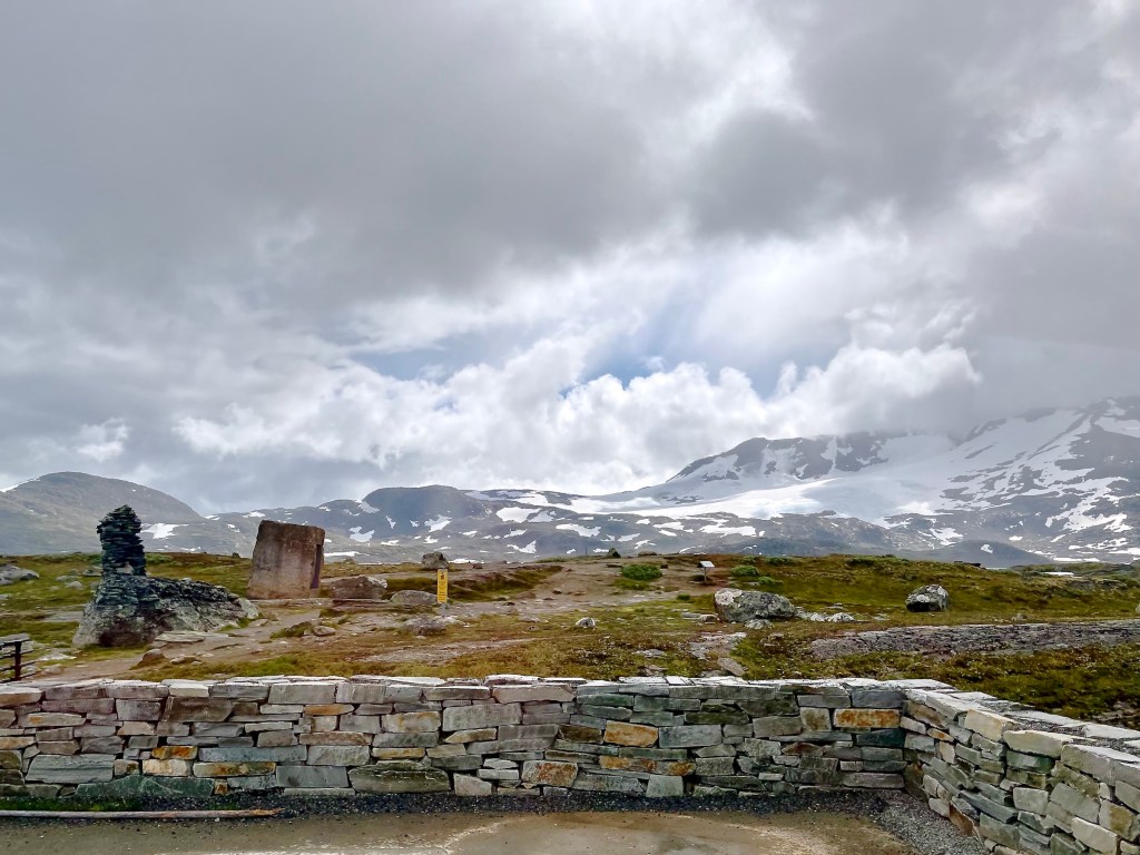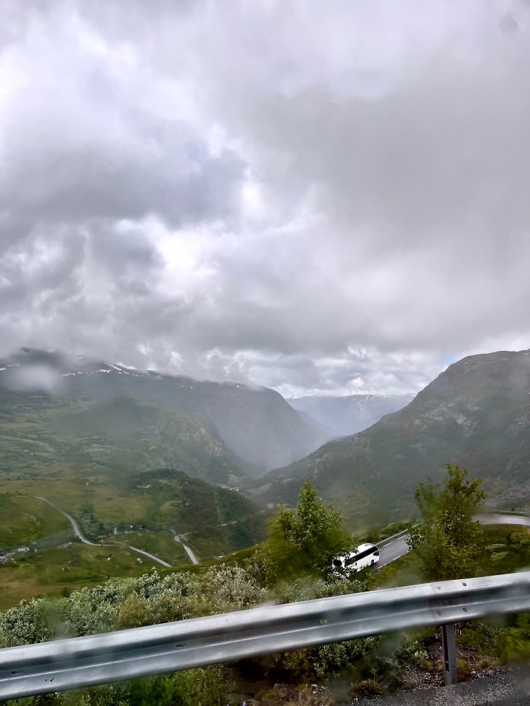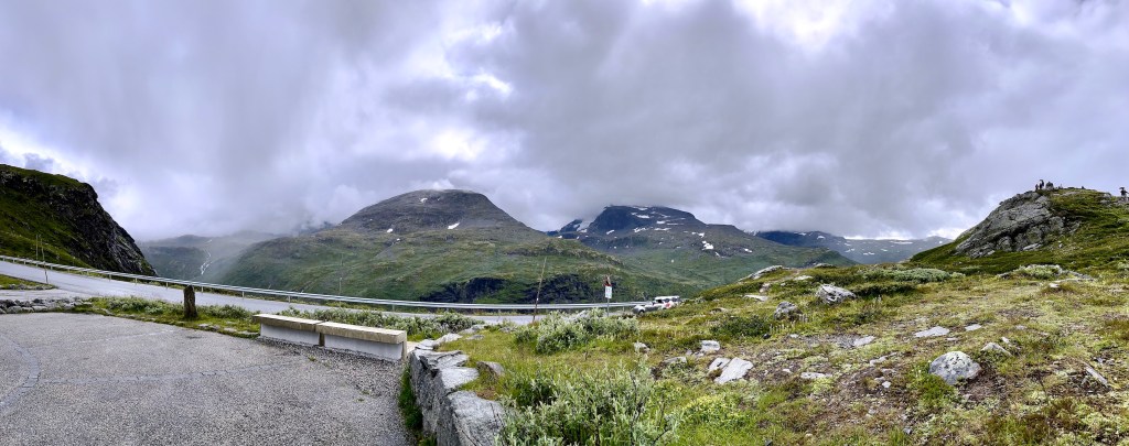 After an extended serpentine climb with an 8% gradient, we stopped at Øvre Oscarshaug rasteplass, the higher of the two picnic areas of dear Oscar, whoever he might be, for a pitstop and photo opportunity. The pitstop part took up pretty much the entire allotted time, as there were only two toilets available, one per gender. As always, the line for the woman’s WC was very long, while the guys zipped in and out of their’s, which only had a urinal, so we were truly stuck with just the one … As far as the photo opportunity was concerned, well, it rained quite a bit off and on, and one had to climb up an uneven path to get to Oscar’s viewing haug or mound. Not an option for me and crocodile stick anyway, so the time lost in line didn’t matter.