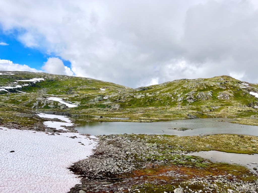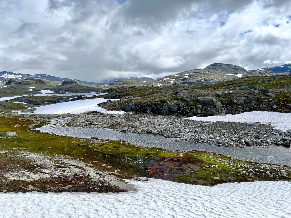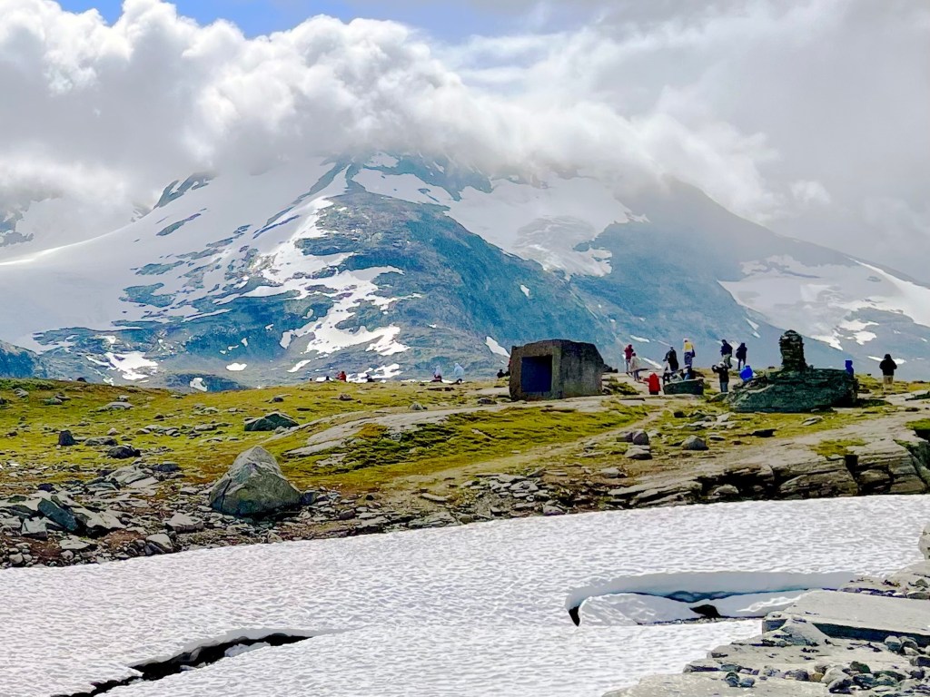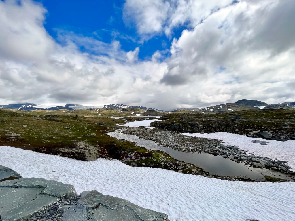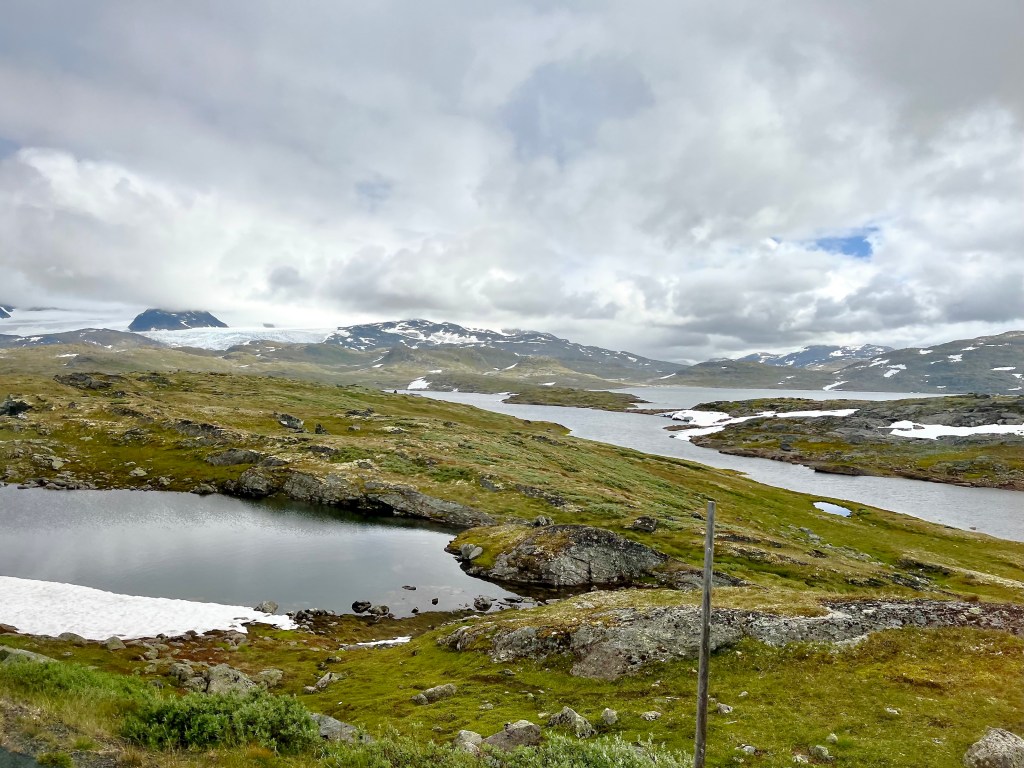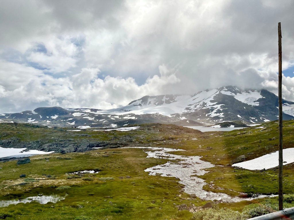Those road marking sticks we saw everywhere were installed along every road and hiking path on the plateau. County road 55 aka Sognefjellsvegen with a peak elevation of 1430 m/4692 ft above sea level is one of Europe’s most popular National Tourist Roads for hikers, bikers, and campers. The marking sticks can be lifesavers during adverse weather, especially with accumulated snow.