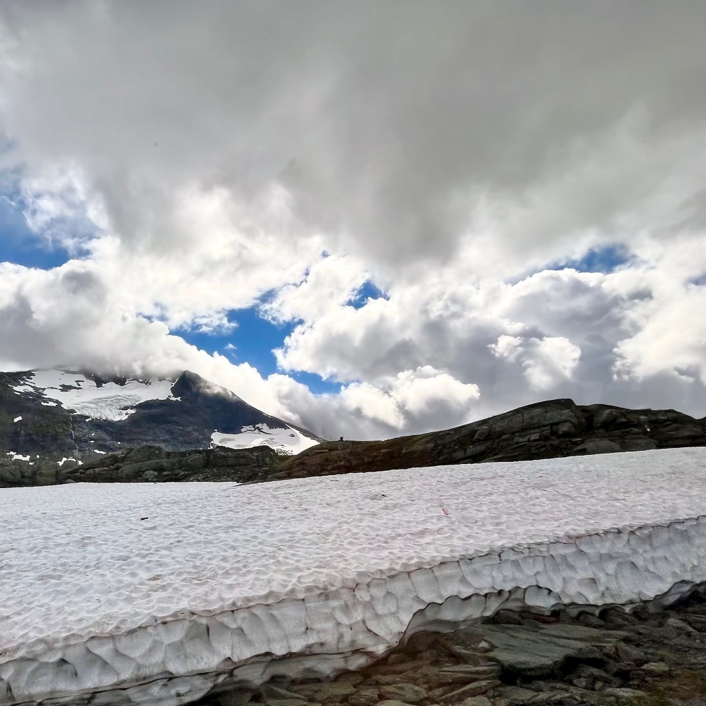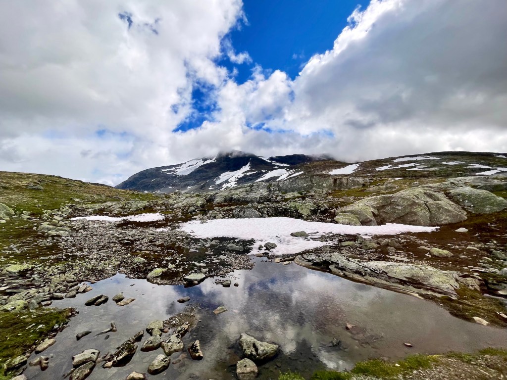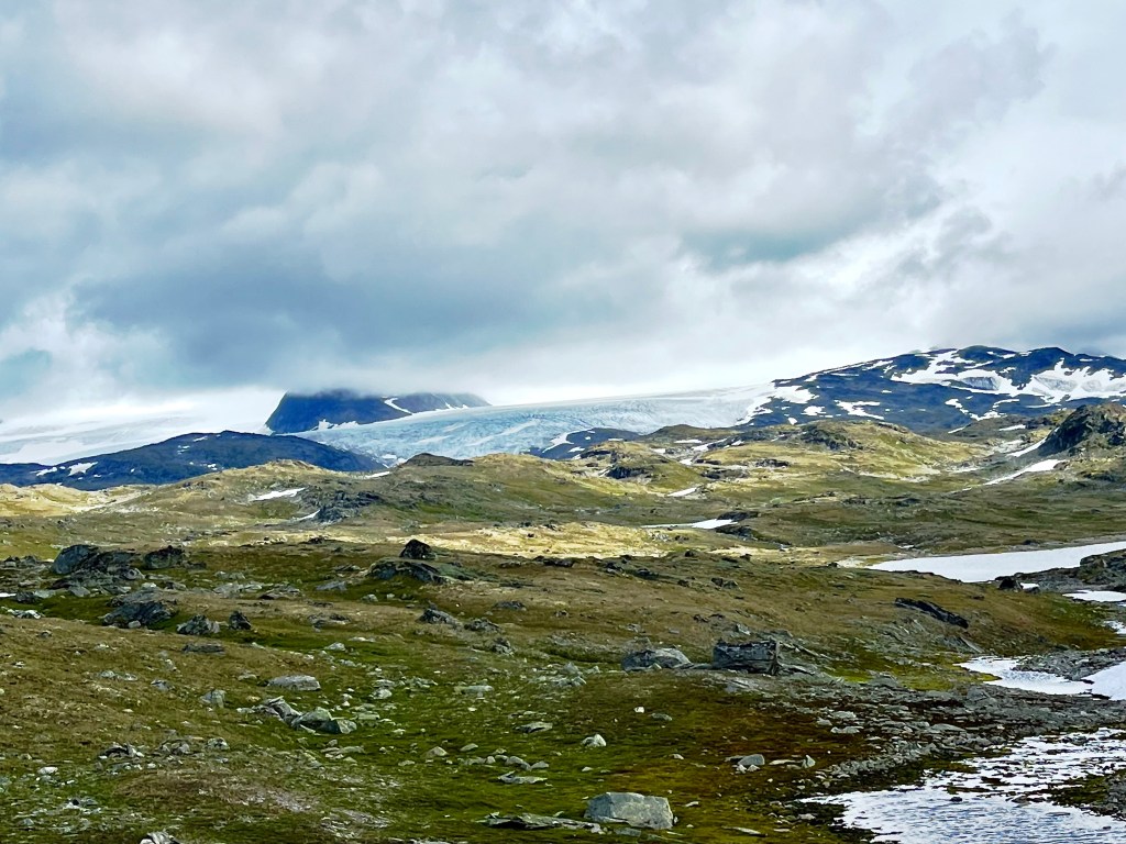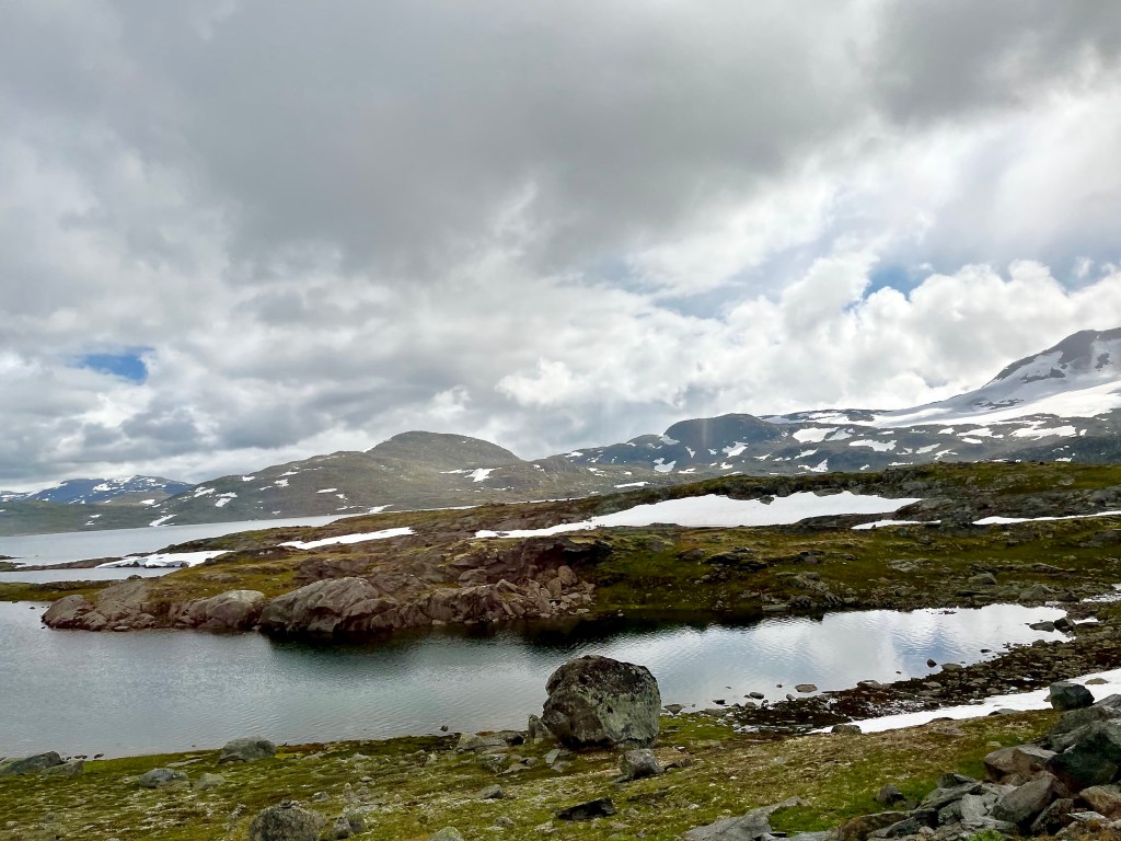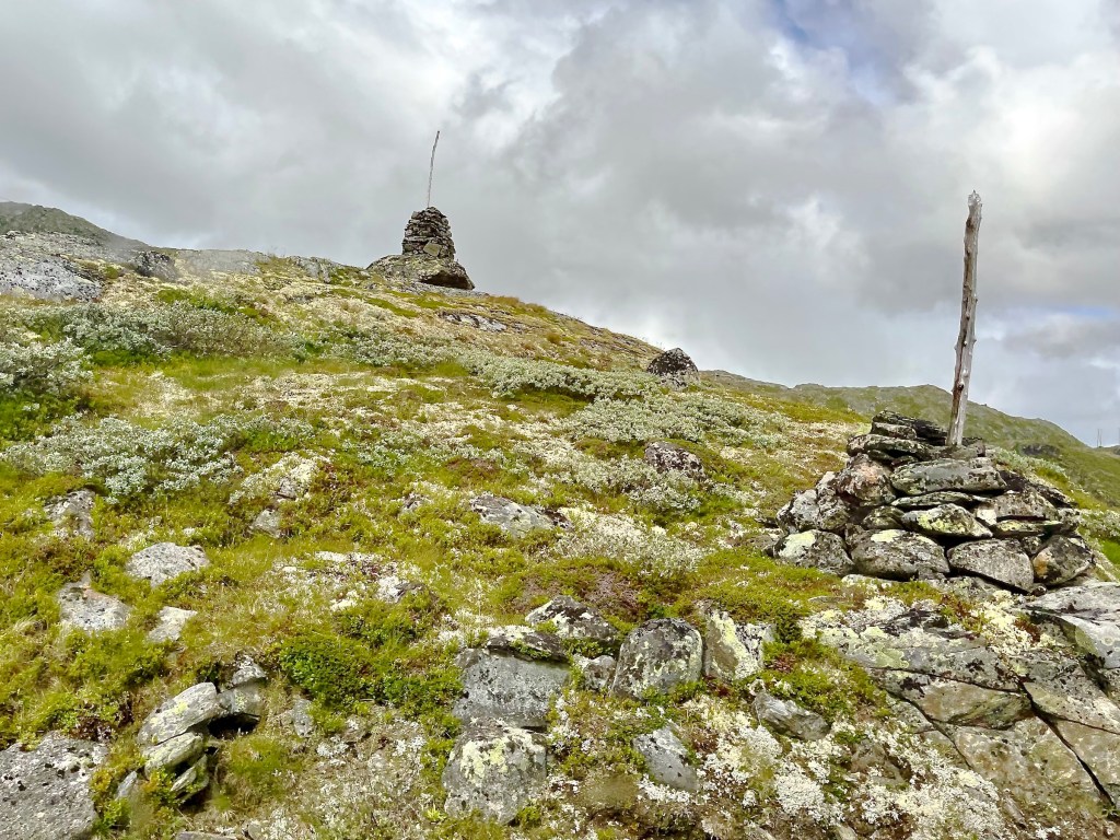 Those road marking sticks we saw everywhere were installed along every road and hiking path on the plateau. County road 55 aka Sognefjellsvegen with a peak elevation of 1430 m/4692 ft above sea level is one of Europe’s most popular National Tourist Roads for hikers, bikers, and campers. The marking sticks can be lifesavers during adverse weather, especially with accumulated snow.